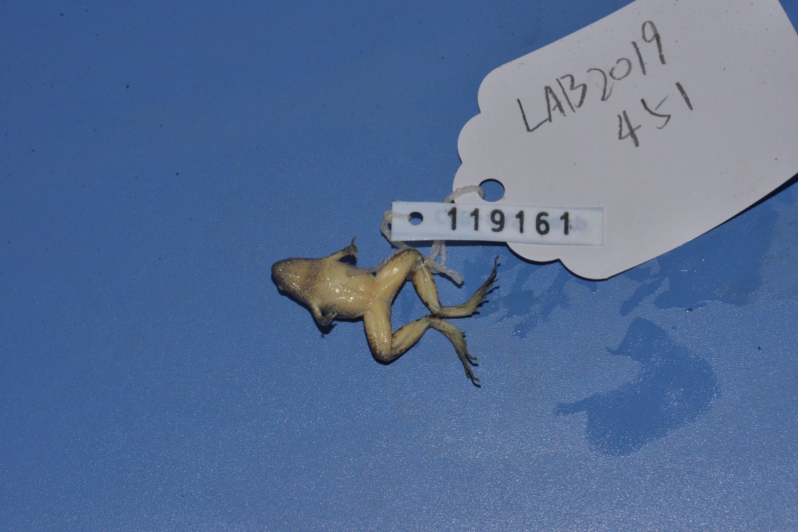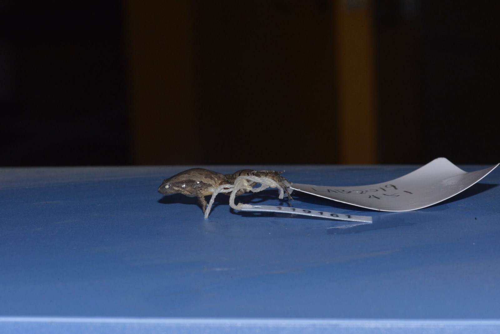 鉴定特征 体小,略呈三角形,雄蛙22毫米,雌蛙23毫米左右。头小,吻钝尖,鼓膜不显,无犁骨齿;舌后端圆。背面皮肤有小疣,由眼后至胯部前方有斜行大长疣;腹面光滑。指、趾端圆,均无吸盘和纵沟,掌突2;后肢粗短,胫跗关节前达肩部,趾间仅具蹼迹。背面粉灰色或灰棕色,上面有前后2个深棕色“^”形斑;咽喉部色深,胸、腹部及四肢腹面白色。雄性咽喉部黑色,具单咽下外声囊;有雄性线。