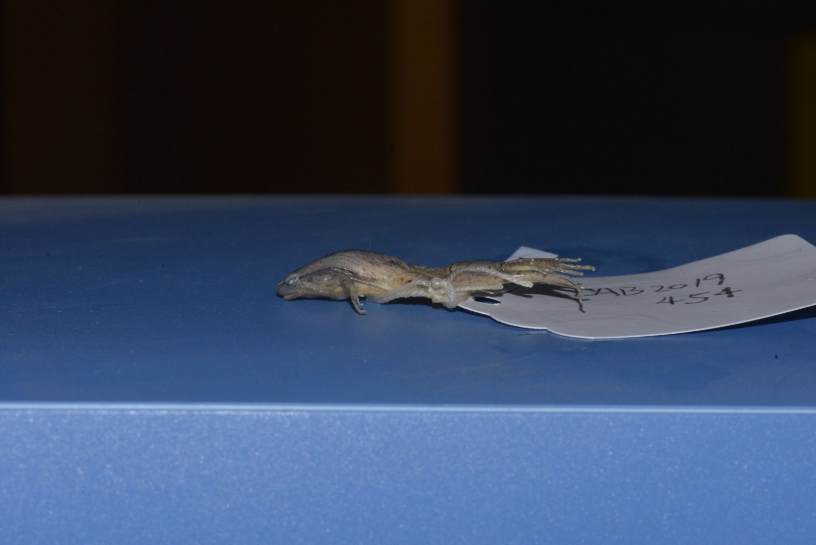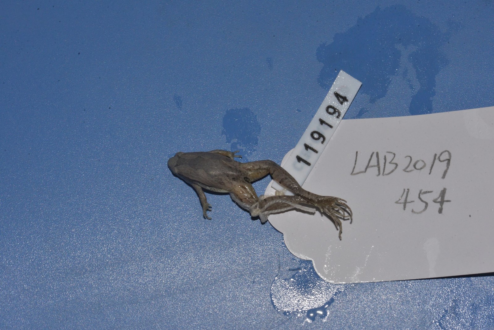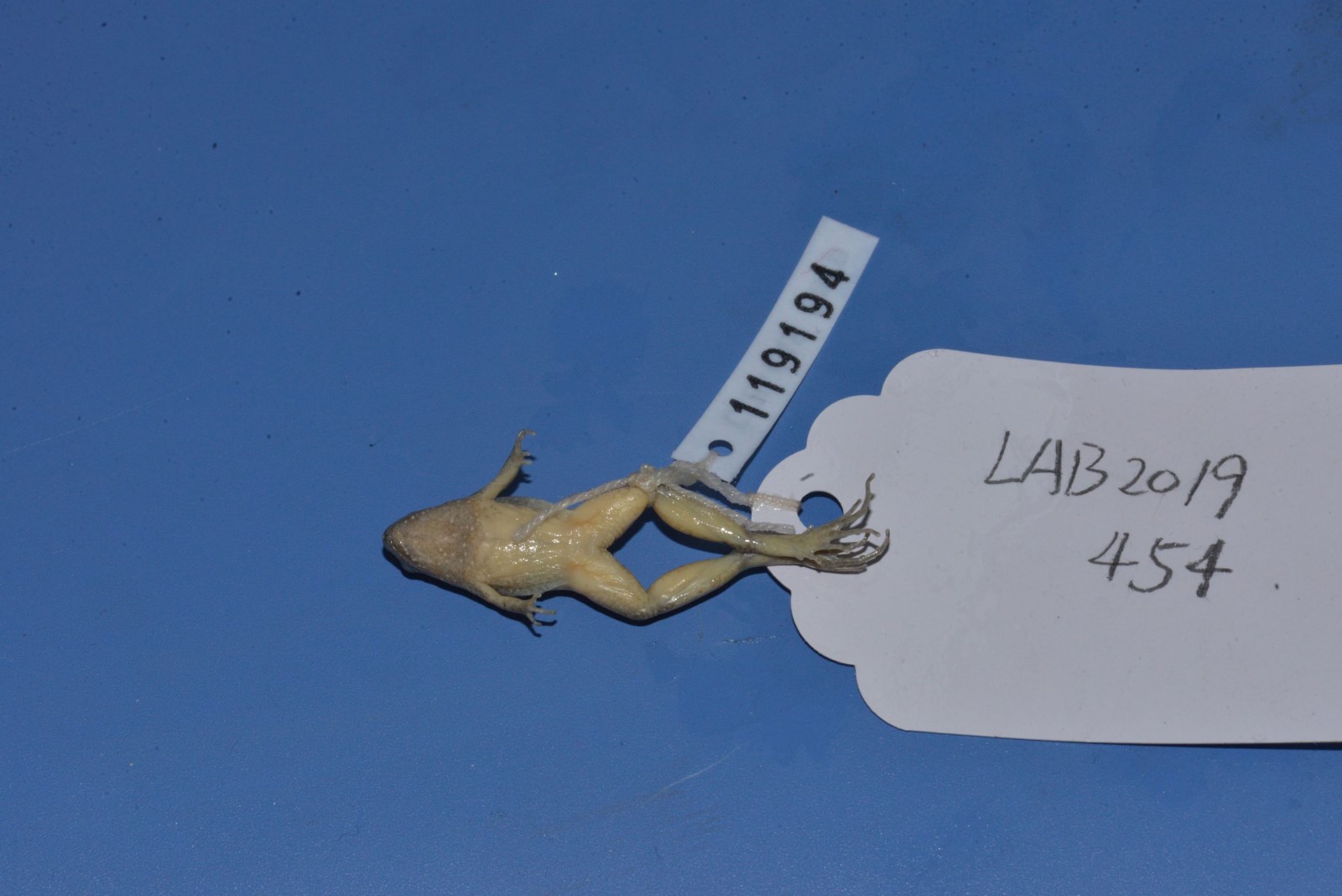 鉴定特征 体小,略呈三角形,雄蛙22毫米,雌蛙23毫米左右。头小,吻钝尖,鼓膜不显,无犁骨齿;舌后端圆。背面皮肤有小疣,由眼后至胯部前方有斜行大长疣;腹面光滑。指、趾端圆,均无吸盘和纵沟,掌突2;后肢粗短,胫跗关节前达肩部,趾间仅具蹼迹。背面粉灰色或灰棕色,上面有前后2个深棕色“^”形斑;咽喉部色深,胸、腹部及四肢腹面白色。雄性咽喉部黑色,具单咽下外声囊;有雄性线。