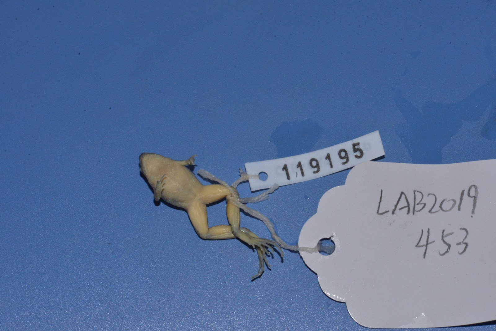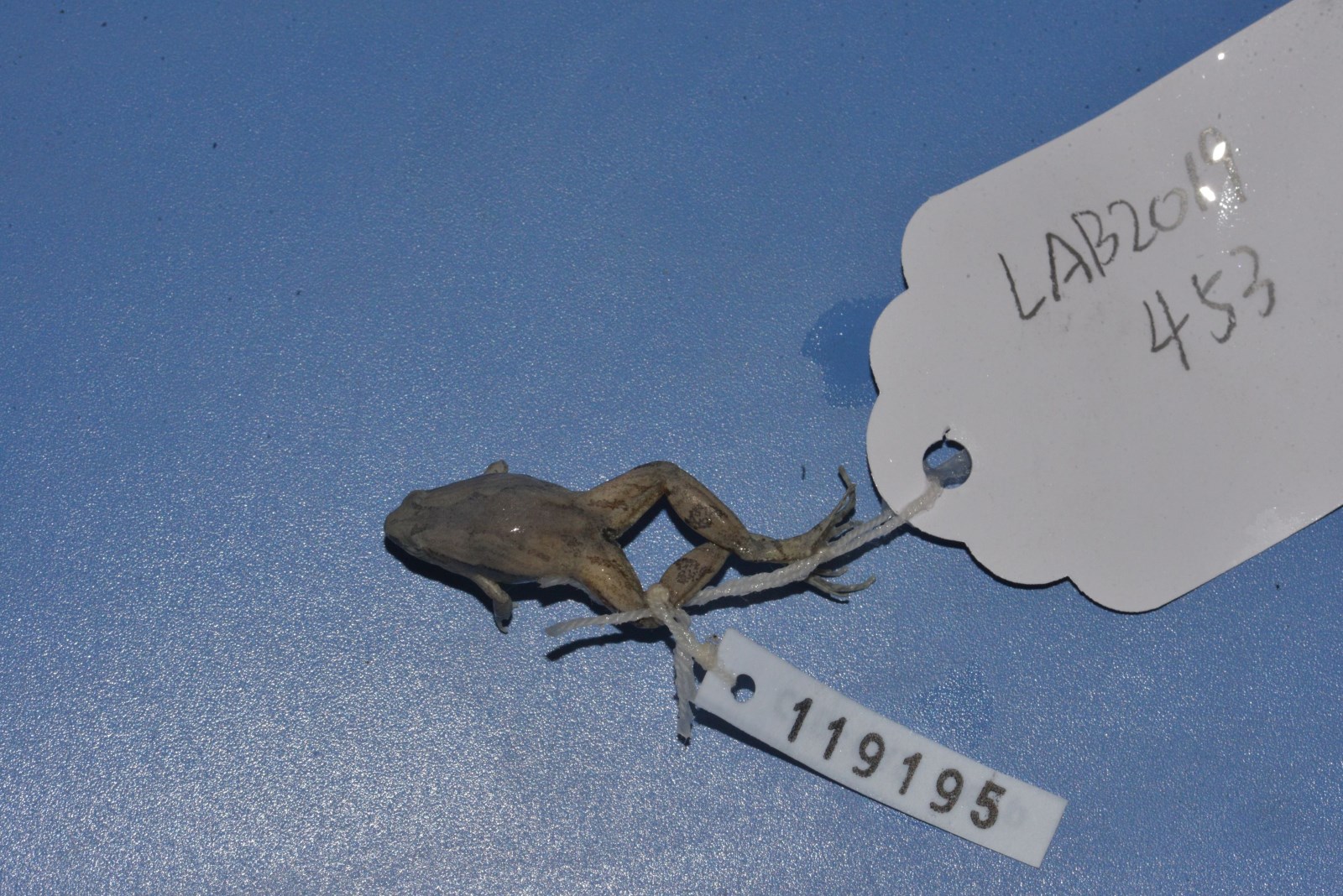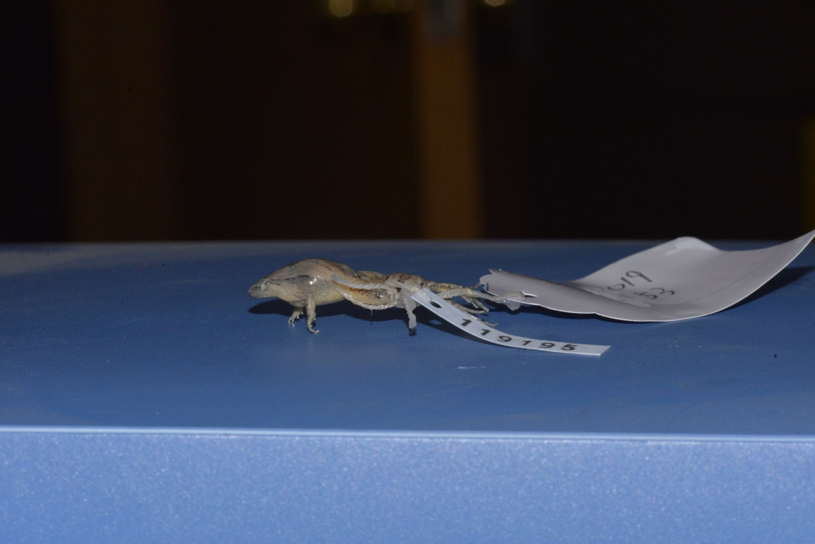 鉴定特征 体小,略呈三角形,雄蛙22毫米,雌蛙23毫米左右。头小,吻钝尖,鼓膜不显,无犁骨齿;舌后端圆。背面皮肤有小疣,由眼后至胯部前方有斜行大长疣;腹面光滑。指、趾端圆,均无吸盘和纵沟,掌突2;后肢粗短,胫跗关节前达肩部,趾间仅具蹼迹。背面粉灰色或灰棕色,上面有前后2个深棕色“^”形斑;咽喉部色深,胸、腹部及四肢腹面白色。雄性咽喉部黑色,具单咽下外声囊;有雄性线。