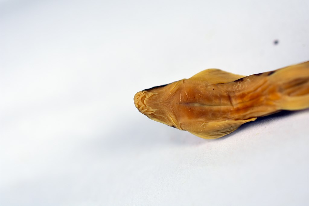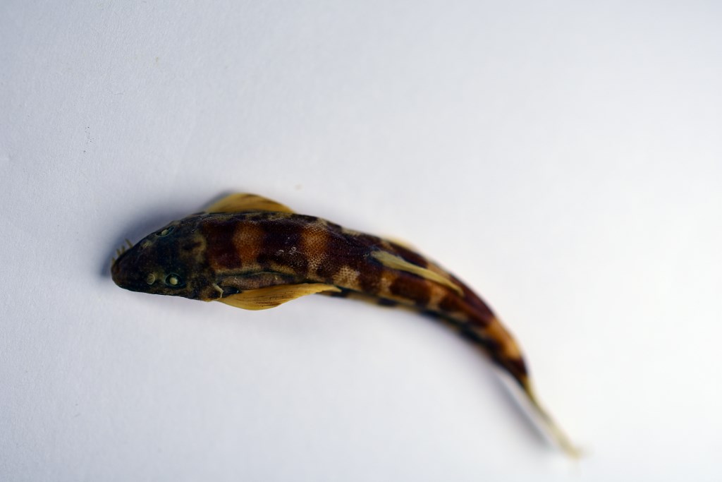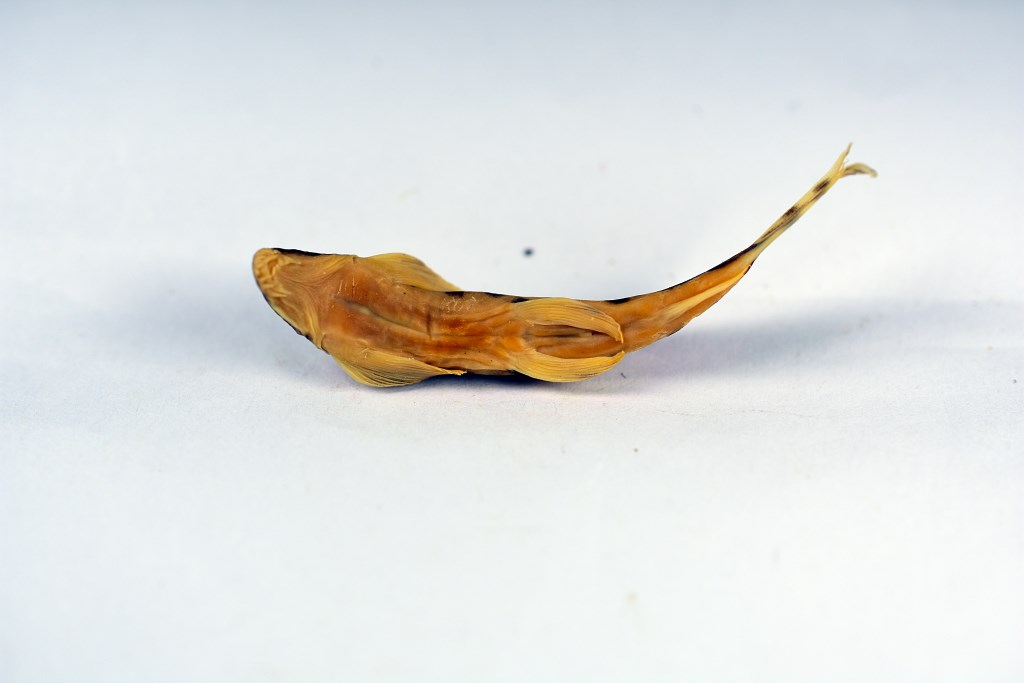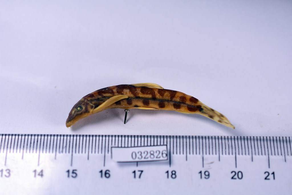 描述背鳍2-7;臀鳍2-5;胸鳍i一15;腹鳍i—8。侧线鳞75-81。体长为体高的5.3—6.0倍,为体宽的5.4—6.4倍,为头长的3.3—4.1倍,为尾柄长的7.5—10.2倍,为尾柄高的8.7—11.4倍。头长为头高的1.9—2.6倍,为头宽的1.3-1.6,为吻长的1.7—2.1倍.为眼径的4.6—6.4倍,为眼间隔的2.8—3.2倍。尾柄长为尾高的1.0—1.3倍。头宽为口裂的2.3-3.1倍。体甚长,尾柄稍侧扁。头低平,边缘较薄。鼻孔有眼前方,有鼻瓣。较短吻须6条,较长吻须7条,彼此排成1行,最长吻须长等于眼径;颌须2对,内侧对在下唇内侧角,很短,瘤突状。鳃孔从胸鳍前文伸达头腹面。侧线完全,在胸鳍上方处稀疏排列的有孔鳞覆于其上,此后侧线平直,伸达尾鳍基部。液浸标本头部灰黑且有暗斑;横跨背中线约有7个“1”字或“H”形的鞍斑;沿侧线有1条纵向黑带、紧靠黑带的上、下方排列着许多点线斑纹。背鳍中部有1列小黑点,胸鳍中部有1根弧形的黑纹;尾鳍有2列小黑点。