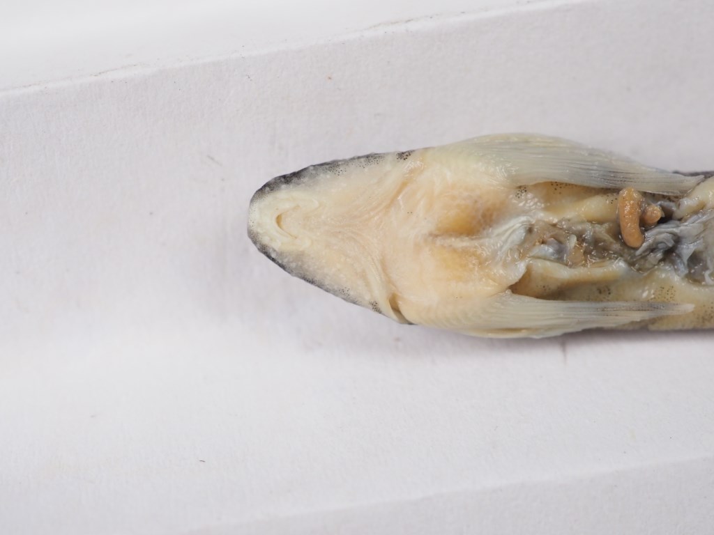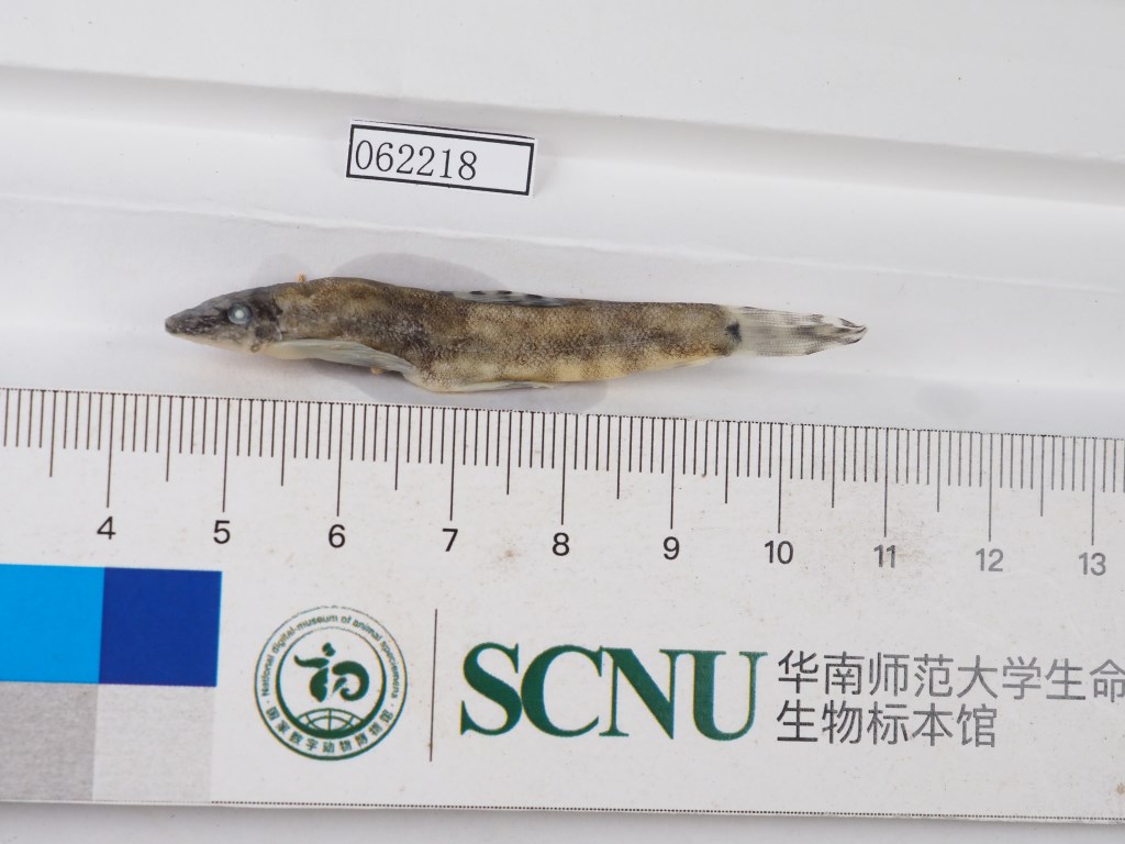 背鳍iii-8,臀鳍ii-5,胸鳍i-16—17,腹鳍i-8。侧线鳞95—106。 体长为体高的6.0—7.2倍,为体宽的4.7—7.2倍,为头长的4.3—5.0倍,为尾柄长的6.8—8.3倍,为尾柄高的10.2—11.2倍。头长为头宽的10.2—11.2倍,为吻长的1.6—1.8倍,为眼径的5.5—6.7倍,为眼间距的2.5—2.8倍。尾柄长为尾柄高的1.3—1.8倍。 体稍细长,前段近圆筒形,后段稍侧扁,背缘略呈弧形,腹面平坦。头稍低平。吻端圆钝。口下位,口裂较小,呈弧形。唇肉质,上唇无明显乳突,下唇具4个较显著的疣状乳突,上下唇在口角处相连。下颌前缘稍外露。上唇与吻端之间具较浅而宽阔的吻沟,延伸到口角。吻沟前具吻褶,吻褶分3叶,叶端尖,分别特化出3—5个大小不等的次级吻须。吻褶叶间具2对吻须,外侧1对较长。口角须2对,内侧1对不明显成乳突状,外侧1对较外侧l吻须为小。颏部、头腹面两侧及吻褶的边缘密布着小乳突。鼻孔2个,位于眼前方,前后鼻孔相近,其间以鼻瓣相隔,鼻瓣压倒后可将后鼻孔覆盖。眼中等大小,侧上位。眼间隔宽阔,平坦。鳃裂较宽,上起眼下缘之后方,沿胸鳍基部前方延伸到头部腹面。体被细鳞,为皮膜所覆盖,头背部及胸腹鳍起点间之前2/3的腹面裸露(腹部裸露区伸达腹鳍起点处)。侧线完全。背鳍起点在腹鳍起点的稍前方,距吻端较距尾鳍基约相等或稍近。臀鳍基长约为背鳍基长的1/2,鳍条压倒后末端接近尾鳍基部。偶鳍稍宽大而平展,外缘弧形,末端近截形。胸鳍起点在鳃裂上角稍前的垂直下方,末端约伸至胸腹鳍起点间的约3/4处。腹鳍左右分开,基部背侧具1稍大于眼径的皮质瓣膜,腹鳍末端稍超过肛门。肛门约在腹鳍腋部至臀鳍起点问的中点或略后。尾鳍末端深凹形,上、下叶约等长。 固定标本体背呈棕灰色,腹面微黄。头背部及体侧布有近圆形的黑色点斑,横跨背中线具6—7道横纹,与体背两侧的两条不连续纵行波纹组成近方形的黑褐色图案,各鳍均具有由黑色斑点组成的条纹。