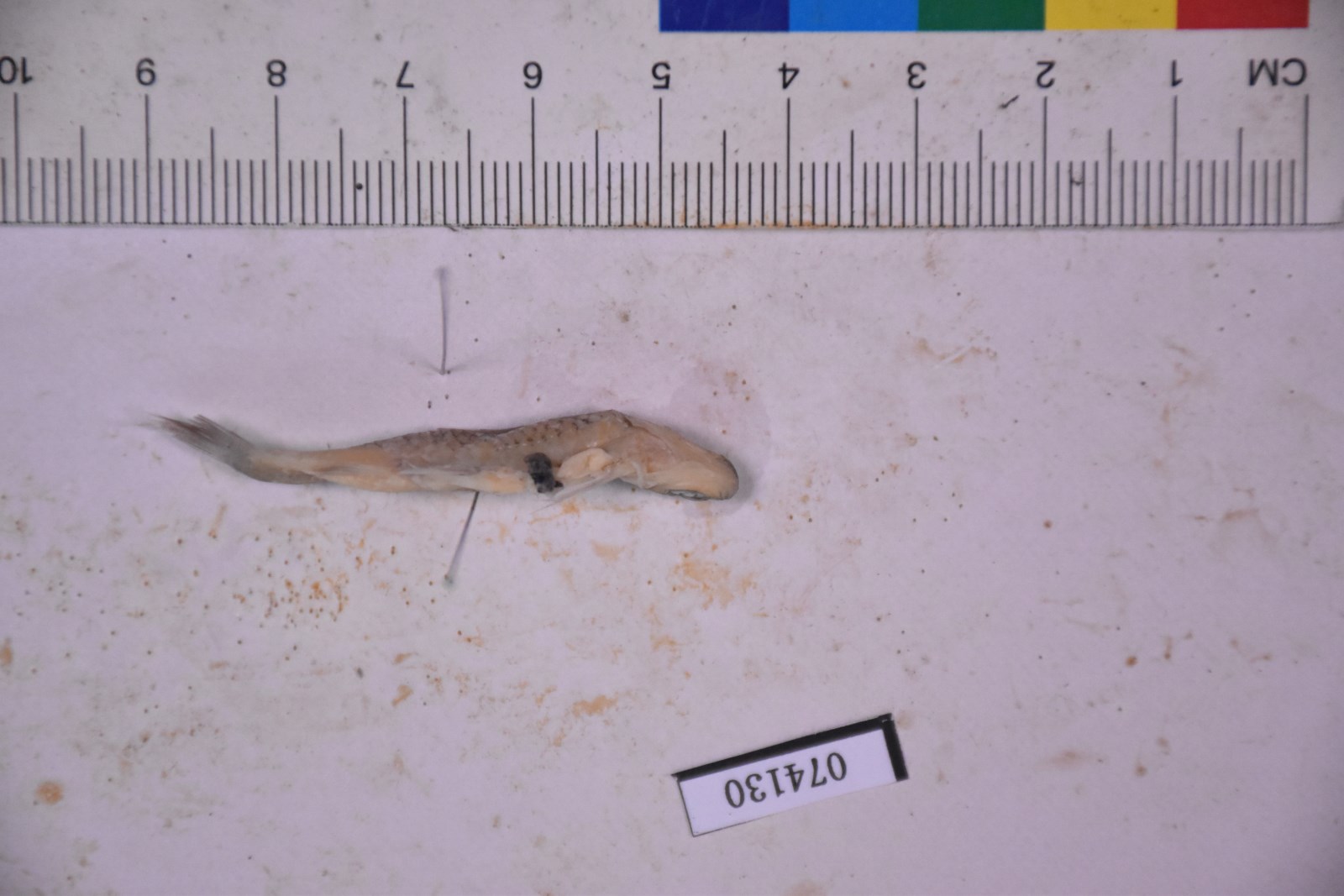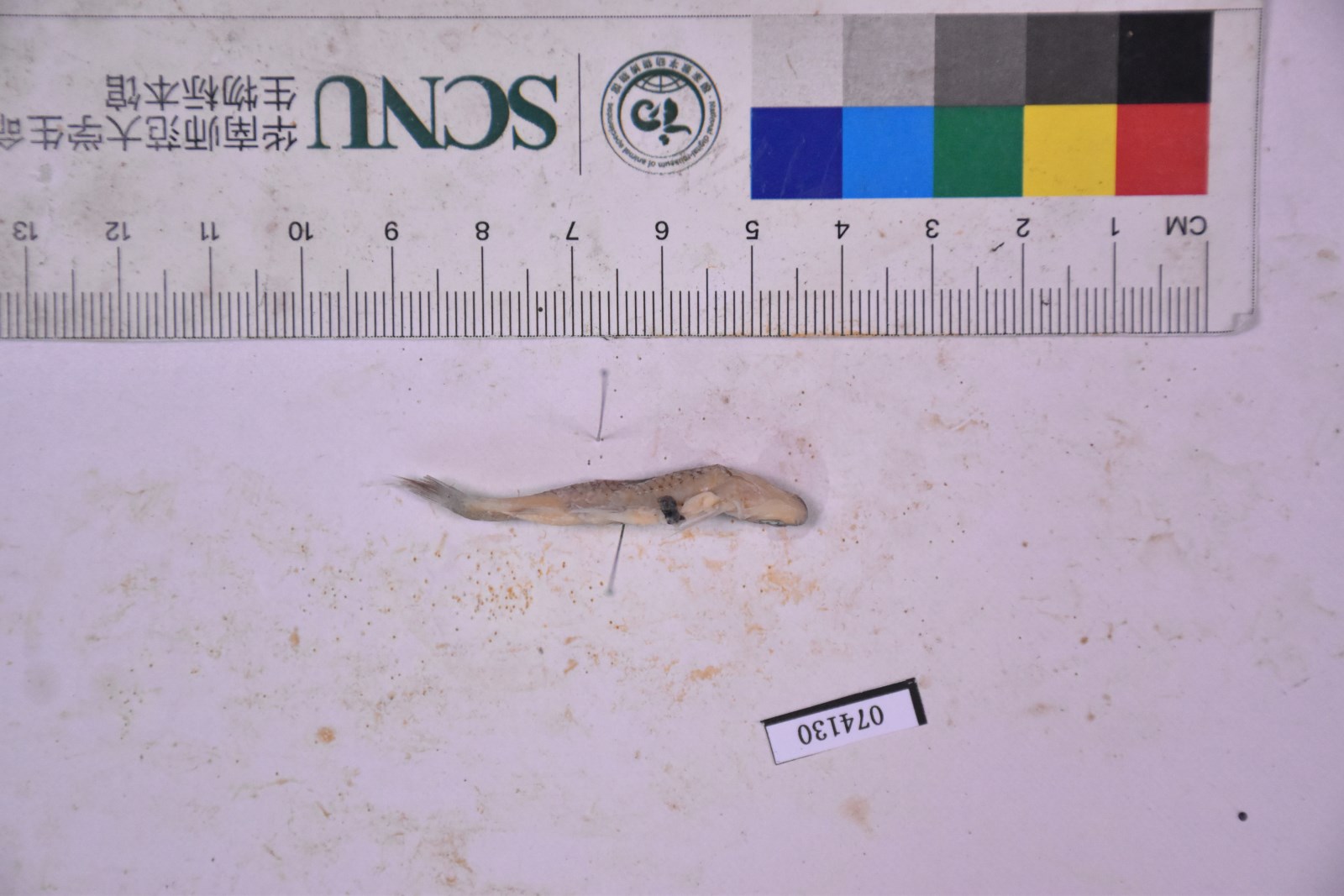 背鳍3-7;臀鳍2-5;胸鳍i一13~14;腹鳍i—8。体长为体高的5.4—6.2倍,为体宽的5.7—7.0倍,为头长的4.7—5.4倍,为尾柄长的9.4—10.2倍。头长为头宽的1.1-1.2倍,为吻长的1.7—1.8倍.为眼径的5.5-6.4倍,为眼间隔的2.3—2.4倍。头宽为口裂的4.8-5.8倍。背面常有角质瘤刺;吻沟在上唇与吻端之间,伸达口角;眼间隔较宽。鼻孔较大,有鼻瓣。下唇外露,上唇无明显乳突,下唇有4-5对分叶状乳突。液浸标本体背棕色,腹部微黄;体背、体侧密布虫蚀斑纹;头背面暗褐色,带有细密的虫蚀斑;侧线下方无纵列黑带,腹鳍鳍瓣及尾鳍基部各有1 个黑色的小斑点;各鳍均有由黑色斑点组成的条纹。