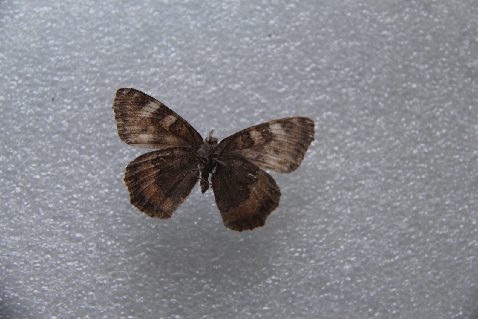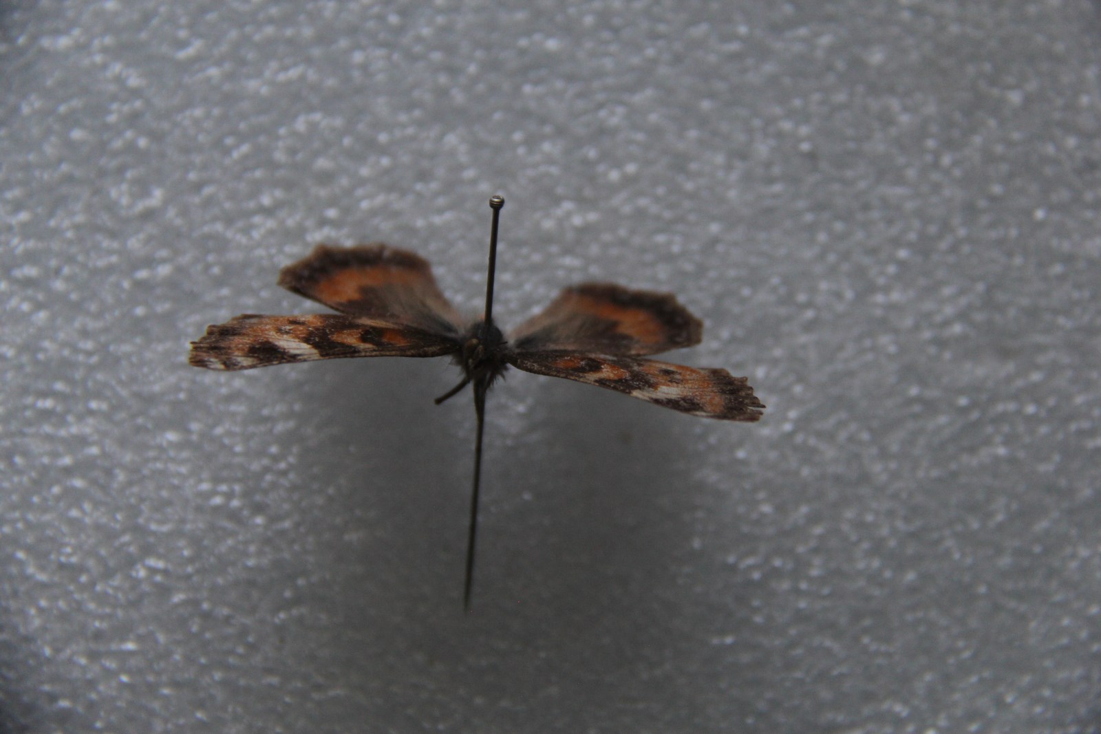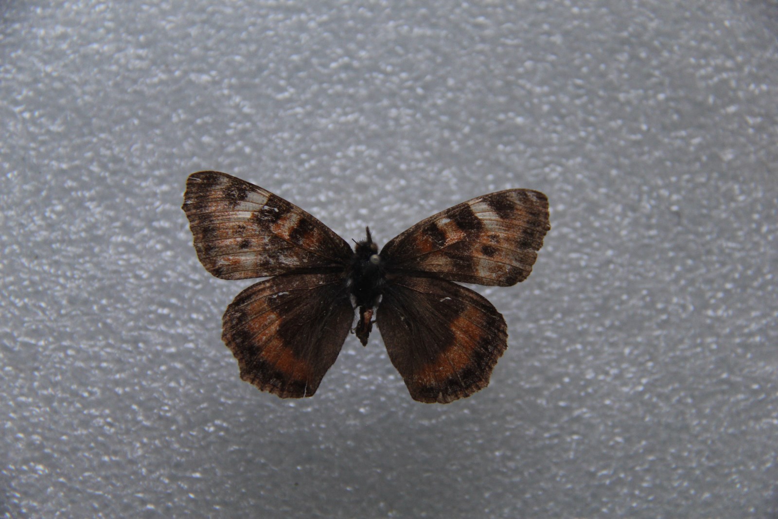 翅橘红色。前翅前缘黄色,有3块黑斑,后缘中部有1个大黑斑,中域有2个较小黑斑;后翅基半部灰色。两翅亚缘黑色带中有淡蓝色三角形斑列。反面前翅黑赭色,3个黑色前缘斑与正面一样,顶角和端缘带黑色;后翅褐色,基半部黑色。外缘有模糊的蓝色新月纹。