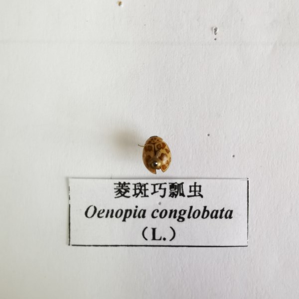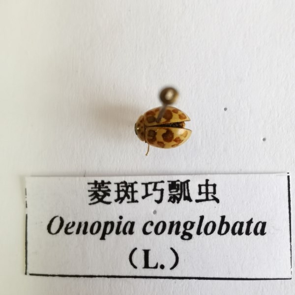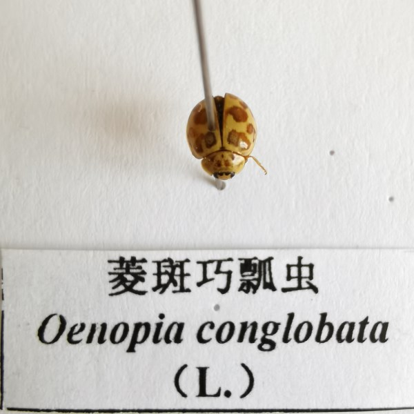 成虫:体长约5mm,宽约4mm。头部黄白色,有时后缘有2黑斑:复眼黑色,口器、触角黄褐色。前胸背板及鞘翅呈黄褐色或紫红色,前胸背板上具7个小黑斑。小盾片黑色或同体色而有黑色边缘。鞘翅上各具8个不同形状的黑斑。呈2、2、1、2、1排列。鞘缝黑色。腹面大部分黑色,仅外缘及端部黄褐色。足黄褐色。