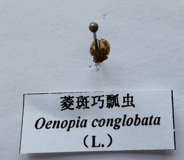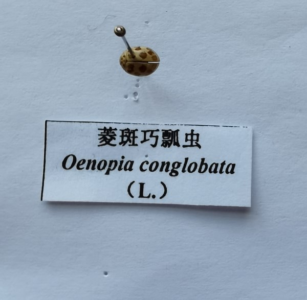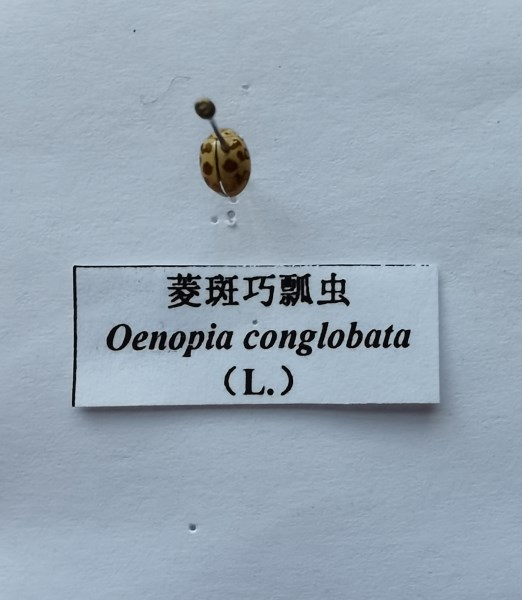 成虫:体长约5mm,宽约4mm。头部黄白色,有时后缘有2黑斑:复眼黑色,口器、触角黄褐色。前胸背板及鞘翅呈黄褐色或紫红色,前胸背板上具7个小黑斑。小盾片黑色或同体色而有黑色边缘。鞘翅上各具8个不同形状的黑斑。呈2、2、1、2、1排列。鞘缝黑色。腹面大部分黑色,仅外缘及端部黄褐色。足黄褐色。