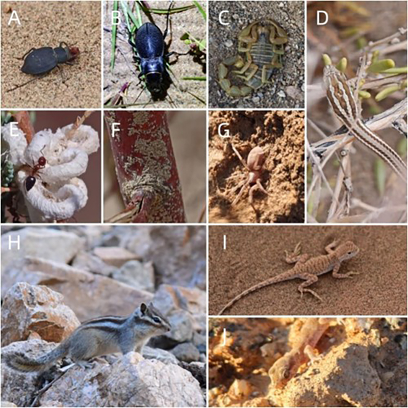 (A-J分别为步甲、漠甲、杀牛蝎、花条蛇、粉蚧、盾蚧、蜘蛛、花鼠、荒漠沙蜥、漠虎)