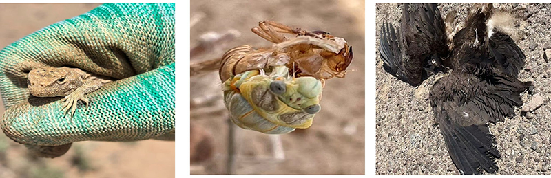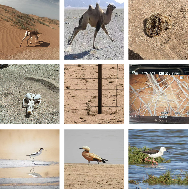 整个科考期间,我们既踏过一望无际的荒凉戈壁,也曾遭遇沙尘暴等极端天气的考验,凭借专业素养与默契协作顺利攻坚克难;镜头下,不仅捕捉到达乌尔黄鼠、骆驼、沙蜥、蛇类及狼的活动踪迹,在巴丹吉林沙漠风景区还邂逅了各类灵动的水鸟,为调查增添了意外之喜。在阿拉善右旗,通过与林草局工作人员的座谈,我们系统掌握了兔狲、岩羊、蒙古兔、鹅喉羚等重点物种的分布区域;途经甘肃酒泉卫星发射基地时,队员们在途中捡拾到了许多形态独特的奇石,成为科考的特殊纪念;抵达额济纳旗后,我们探访了“小小居延海,连接中南海”的生态地标居延海,徜徉于金黄璀璨的胡杨林秘境,近距离观测到蒙原羚、蒙古兔、鹅喉羚等物种的野外活动状态。