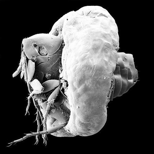 一只穿透皮肤的沙蚤在扫描电子显微镜中的形态。图片来源:科学之眼