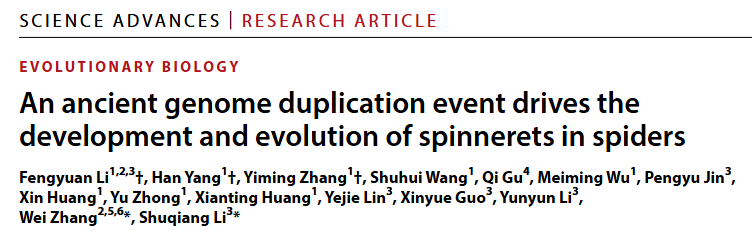 2026年1月14日,中国科学院动物研究所、北京大学与安徽师范大学的研究团队在Science Advances上发表题为An ancient genome duplication event drives the development and evolution of spinnerets in spiders的研究论文。该研究利用多组学技术以及系统全面的验证手段,发现abd-A基因的两个拷贝共同促进蜘蛛纺器的形成,并进一步招募肢体建造基因dac-1参与纺器的精细构建。该研究不仅揭示了蜘蛛纺器这一关键适应性结构的发育与演化机制,也为后续基于纺器生物学原理的仿生材料构建提供了重要的理论依据。