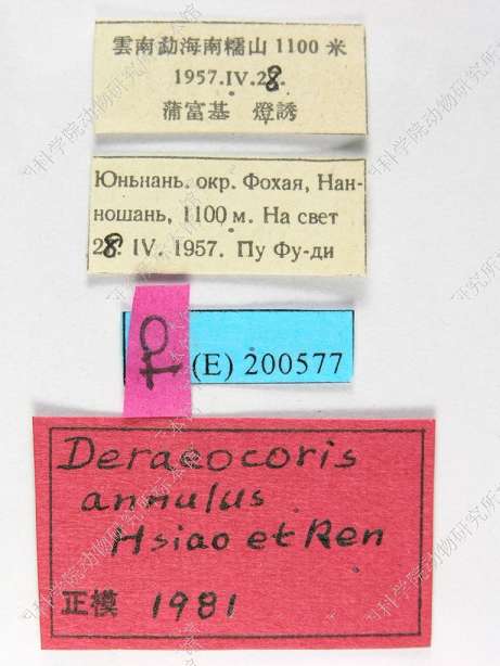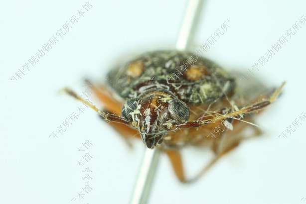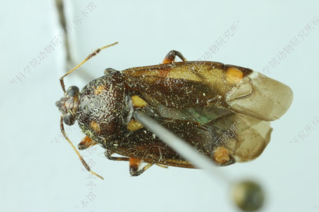 ♀。长7.3毫米,腹部宽3.2毫米。身体背面深褐色,具黄色斑,光亮无毛。头及前胸背板胝黑色,光滑,前胸背板及前翅具粗糙刻点。头顶中央纵纹、前胸背板中部两个圆斑、小盾片两侧两个大斑点、楔片中央大圆斑、触角第2节中部及第3节基半部黄色(有时头顶及前胸背板黄色斑纹消失)。身体腹面红黄色,喙、各足股节顶端、胫节两端及中央栗色。 头长0.5毫米,宽1.23毫米,头顶宽0.53毫米,后缘具隆脊,眼靠近前胸背板的前缘,触角具稀疏黄色长毛,第2节由中部以下渐粗,各节长0.5: 1.4: 0.6: (第4节缺)毫米。喙不达于中足基节顶端,第1节仅达于头的后缘,各节长0.5: 0.5: 0.7: 0.7毫米。前胸背板1.1毫米,前端宽1.2毫米,侧角间宽2.5毫米,领粗,晦暗,0.8毫米,细于触角第1节,侧缘几近平直,略成脊状,后缘平直。小盾片尖平,长1.3毫米,基部宽1.4毫米。前翅长5.6毫米,超过腹部末端1.2毫米,革片长3.3毫米,缘片具均匀刻点,楔片长0.9毫米,膜片褐色一色。足具稀疏长毛,前足股节长1.4毫米,胫节长1.5毫米;后足股节长2.0毫米;胫节长2.3毫米,具褐色细刺;跗节第1节短于第2节,爪基部弯曲,显著。 正模,♀,云南勐海南糯山1100米,1957. IV. 28,蒲富基灯诱(存中国科学院动物研究所),副模♀,四川峨眉山报国寺600米,1957. V. 6.。