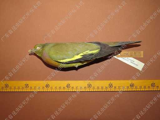 中等体型(29厘米)的绿鸠。黑色的翼上具醒目的黄色纵纹和翼缘。脸前部绿色,颈背及上背灰色。雄鸟下体黄绿,上胸淡紫,下胸橘黄;雌鸟胸部绿色。尾灰色,外侧尾羽具黑色次端斑。虹膜-蓝色及红色;嘴-绿蓝;脚-深红。叫声:抑扬顿挫的哨音接以ko-wrrrook, ko-wrrroook, ko-wrrroook声,告警时发粗哑的呱呱声或kreeeew-kreeew-kreeew。分布范围:印度、东南亚、爪哇及巴厘岛。分布状况:亚种domvilii为罕见留鸟见于海南岛,迷鸟有见于台湾。习性:典型的本属特性。成对或有时成小群活动。取食于矮小的有果灌丛及果树。具典型的的绿鸠式的抽尾炫耀。喜有林低地及人造林