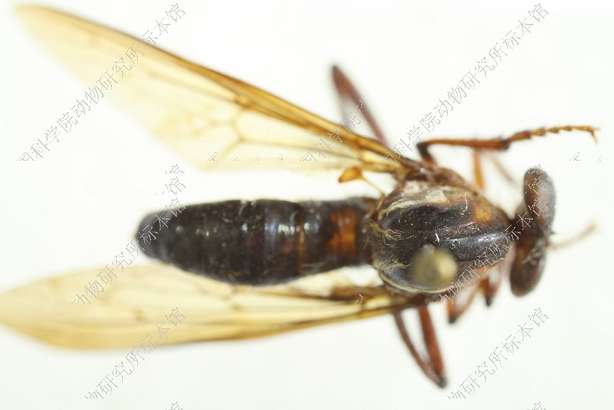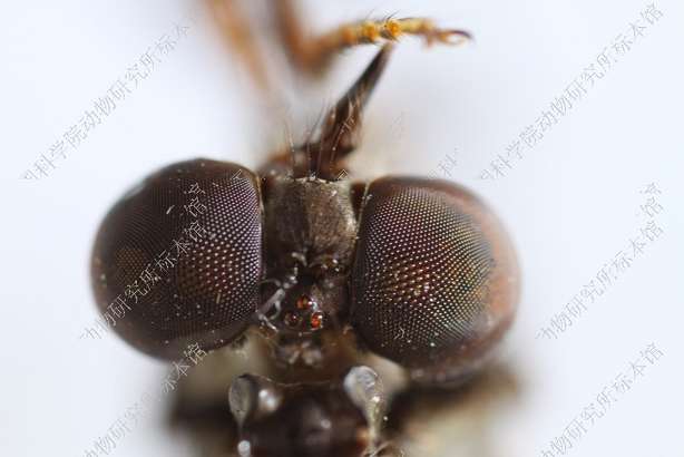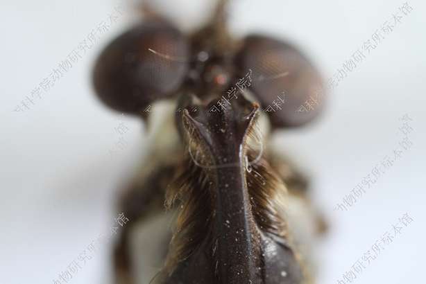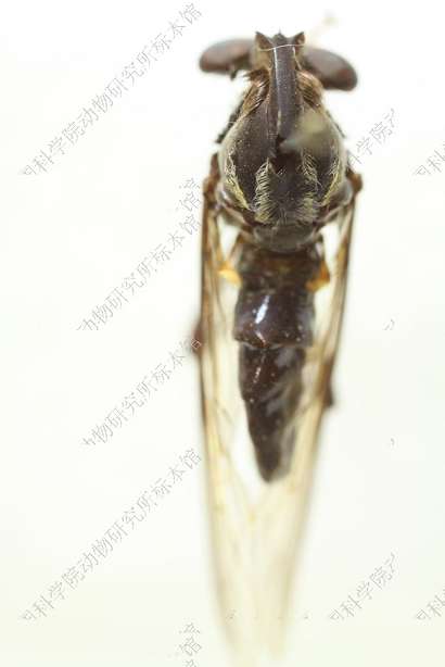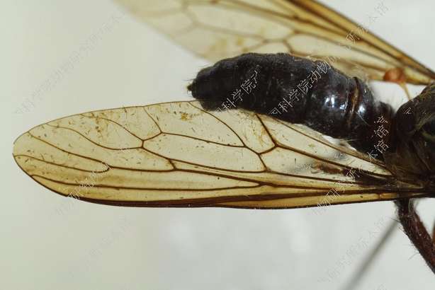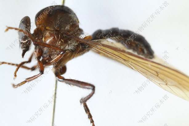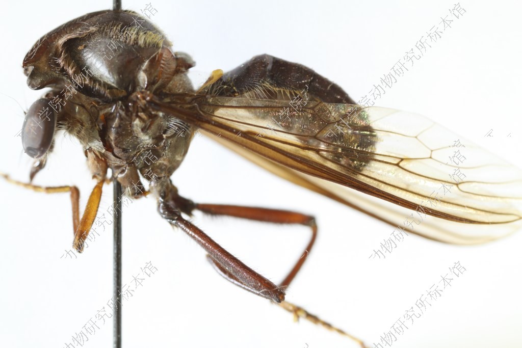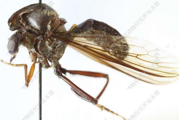 雄 体长12 mm,翅长10 mm。 头部宽于胸部,黑色,覆金黄色绵毛,口鬃黑色,一行4根,额鬃和单眼鬃缺如,后头黑色,覆淡黄色绵毛,被淡黄毛,无后头鬃,触角黑色,第1节短,为第2节长度之半,腹面具一根黑鬃,第3节念珠形,触角芒红棕色,端部白色,下颚须黑色,被黑鬃,喙黑色。 胸部黑色,覆淡黄绵毛,被黑毛,后部被少量淡黄长毛,肩胛黑色,胸部各侧片黑色,覆淡黄绵毛;小盾片黑色,背面覆淡黄绵毛,后缘被淡黄毛。足红棕色,前足腿节膝部黑色,后足腿节长而加粗,腹面全长具粗鬃,中部具宽阔黑环,胫节端半部黑色,跗节黑色。翅烟褐色,缘室和5个后室均开放,臀室闭合具长柄,前横脉位于中室后方1/3的部位,平衡棒黄褐色。 腹部红棕色,背腹侧扁,基部略缢缩,被倒伏小黑毛,各背板后缘黑色,第2-5背板两侧后角黑色。生殖节红棕色,被黑毛,下生殖板背面前端中央突起,着生黑鬃,下方具细长肢,端部具3根黑鬃,阳茎黑色,基部宽阔,端部骤细,圆柱形,向上方伸展。