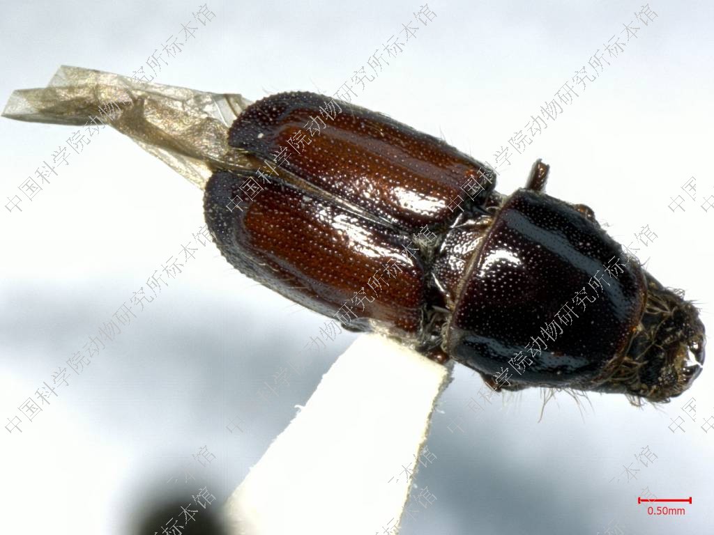 描述体长3.7-4.9毫米(图23: 1-3)。体色甚深,全部黑色,前胸背板前缘和鞘翅纵中部深褐色,有强光泽,体表多长毛。雄虫额部狭长凹陷,有锐利的额周棱角,额下缘口上片中部缺刻深大,成一半圆,额成遍布粗阔的条纹,纵贯上下,纹间散生刻点,越近下缘越加粗大;额毛甚多:有遍铺额面的疏散茸毛,也有稠密聚集的额缘毛,颜色黑褐,柔长厚密,把额面包围起来。雌虫额部宽平,额面遍布细窄的纵向条纹,条纹间遍散刻点;额毛起自刻点中心,黑褐长直,稠密匀布。前胸背板长小于宽,长宽比为0.9。背板刻点细小,中部疏散,周围稠密,有平滑无点的背中线,断续延伸;背板有黑褐色长毛,发生在亚前缘、前缘两侧和背板侧缘上。鞘翅长度为前胸背板长度的1.6倍,为两翅合宽的1.4倍;背面观鞘翅侧缘在向后延伸的同时逐渐收缩狭窄,尾端圆钝,整个轮廓呈长盾形,翅缘上环列着大锯齿,规则匀称。小盾片覆盖着灰白色微毛。刻点沟不深陷,沟中刻点给椭圆形,稠密规则,成为径直的行列;沟间部宽阔,刻点疏小,各自一列;翅面上的茸毛较多,细长黑褐色,发生在翅端、翅侧和个别的沟间部刻点中心。腹部缓慢收缩,第1与第2腹板构成弧形腹面;腹面没有特殊结构,只有细柔的长毛,均匀散布。