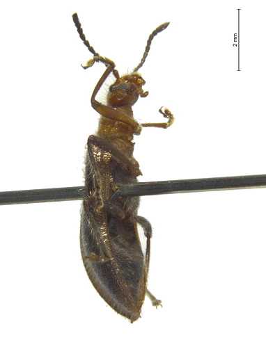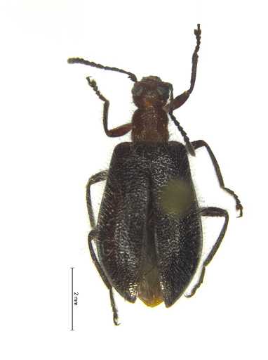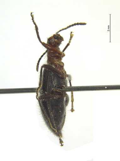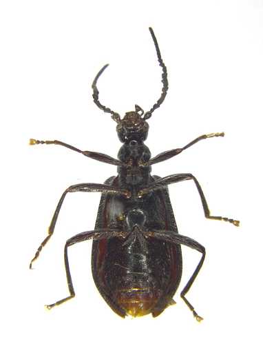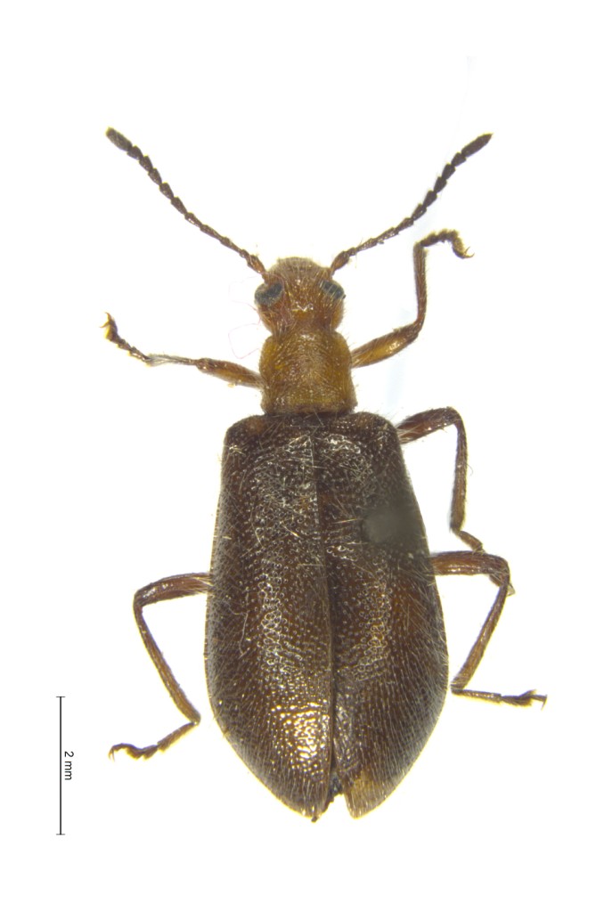 ♂:头、前胸背板、足褐色至黑褐色,触角鞭节黑褐色,鞘翅色较深,深褐色至黑色,个别单一黄褐色(未成熟个体?);背面有白色的长茸毛。体长6.0-7.0 mm。头近与前胸背板等宽,上唇、唇基前缘均凹,额唇基沟弧形弯曲,中间深,两侧浅;额侧突基瘤光亮,隆起甚高于唇基,额不平坦,刻点粗密;复眼细长,前缘中部深凹,稍高于眼间额,眼间距与复眼横径相等;触角向后超过鞘翅肩部,基节粗壮,第4-7 节甚变形,内缘有刃脊,第8 节细小,第9 节端部内缘强烈齿状突出,第10 节稍齿状突出,第11 节弯曲,腹面稍凹,等于其前5 节长度之和。前胸背板布密集的刻点,中区的较细小,隆凸,基部背面两侧有横压痕;中部稍前收缩,前、后缘清晰,后缘低于盘区,前角圆,后角略突出。 鞘翅刻点间区为1-3 个刻点直径,向两侧渐密;肩角稍隆起;鞘翅饰边仅肩部不可见;缘折常形。足、腹部常形。 ♀:体长6.8-7.5 mm。眼间距稍大于复眼横径;触角末节等于其前2 节长度之和。前胸背板中央有纵向的密毛疤痕
