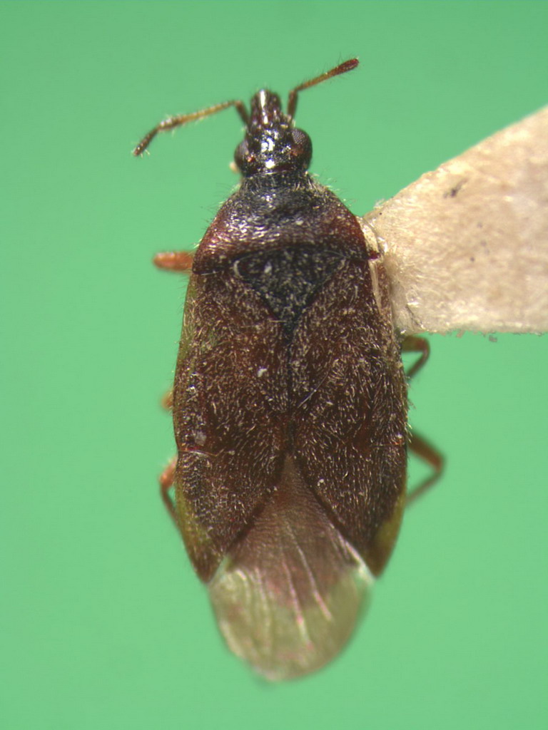 体长1.6~2.0mm。头黑褐,前端略浅,头顶中部有毛。触角第2节污黄,较粗,第1、3、4节污黄褐色,其上毛长者接近该节直径。前胸背板黑褐,四角有直立长毛,侧缘直,前半略成薄边状。前翅爪片,革片淡色,楔片褐至深褐色,雌虫有时革片与楔片全黑,膜片灰白,有时后半部分色深。外革片长0.62mm,楔片长0.32mm。前足股节端半及胫节黄色,其余褐色至黑褐色。
