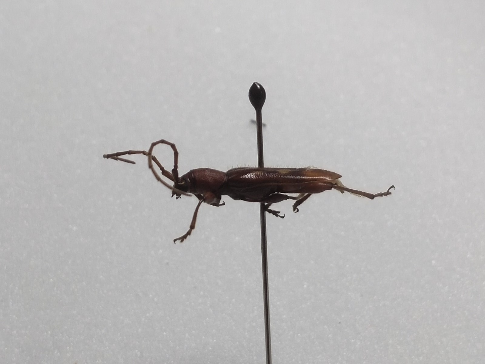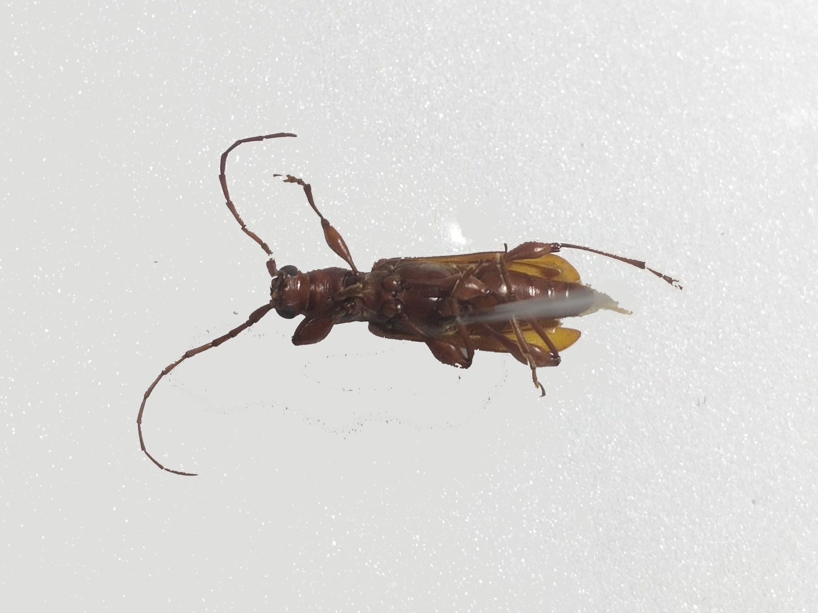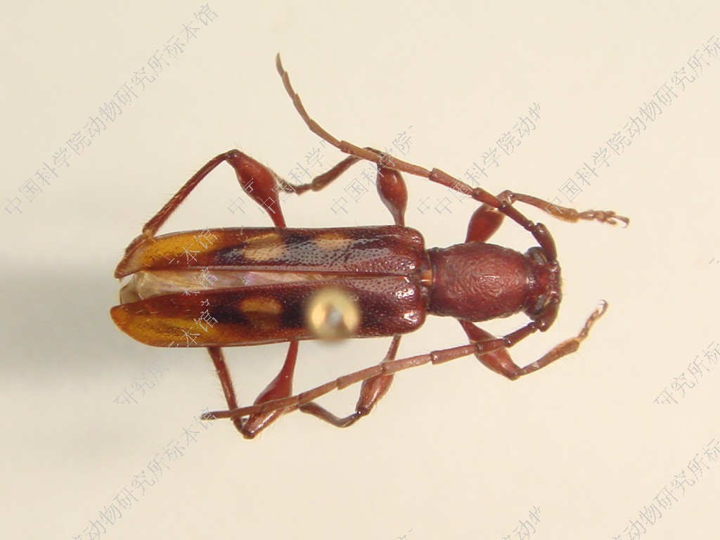 体长8.0-14.0毫米。体深红或赤褐色,头与前胸深暗;鞘翅有光泽,中间三分之一呈黑色或棕黑色,此深黑色区域有前后两个黄色椭圆型斑纹。雄虫触角与体等长或稍长,雌虫较体短;内侧绒毛较多,第三节与第一节约等长,较第三节略长。前胸略成圆筒形,中间稍宽。小盾片密被灰色绒毛。鞘翅有绒毛及疏稀竖毛末端成锐圆形。