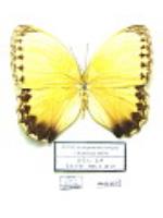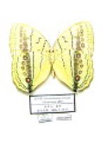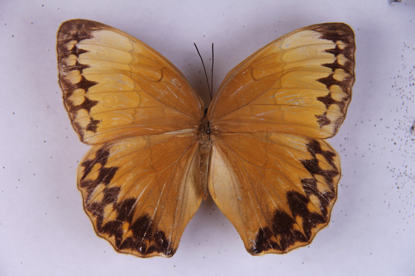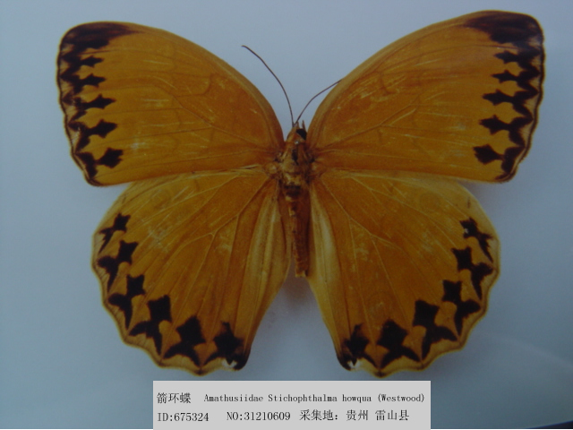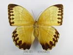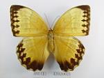 大型环蝶。雄蝶背面为同一均匀的橙黄色,前翅翅顶有黑色纹,前后翅外缘排列着清晰的黑色箭形纹,腹面有2道黑褐色线纹,前翅中室端两线纹间有短小的反S形短纹,前后翅排列着1串橙色圆斑。雌蝶斑纹与雄蝶相似,腹面底色更偏青黄,前后翅的外横线外伴有白斑。