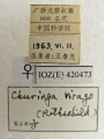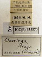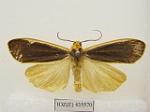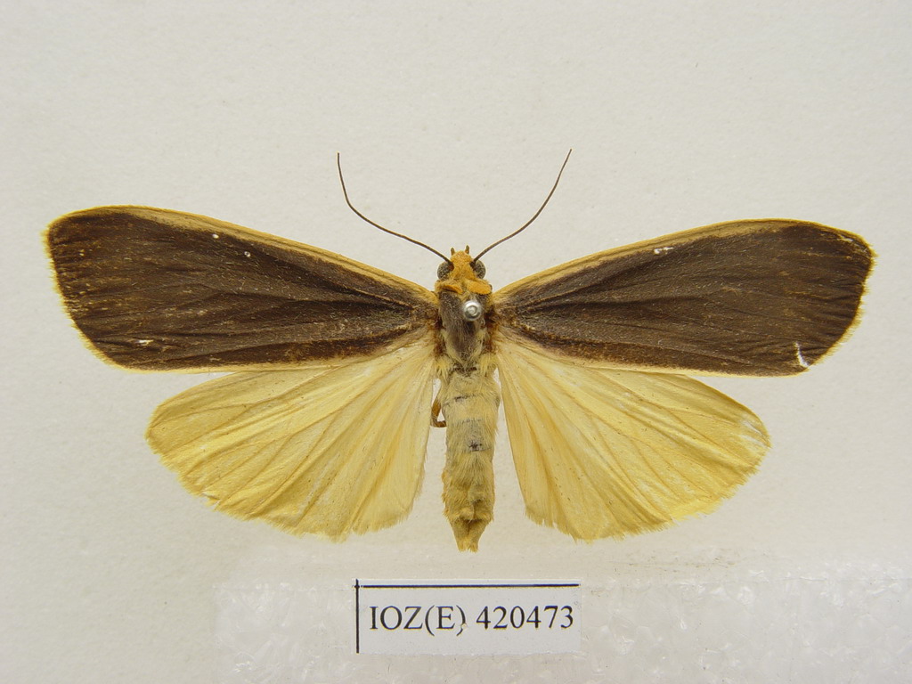 翅展52-60mm。头、颈板橙色至橙红色,触角及胸黑褐色,下唇须顶端黑褐色,翅基片暗褐色,侧缘具黄毛,下胸、足及腹部黄色,前足与中足胫节及跗节散布褐色,腹部末端及腹面橙色;前翅黑褐色,前缘从基部至中部外具一淡黄带、后缘有一淡黄带,缘毛淡黄色;后翅黄色;前翅反面前缘、外缘区及后缘黄色。
