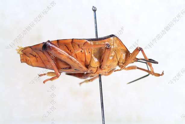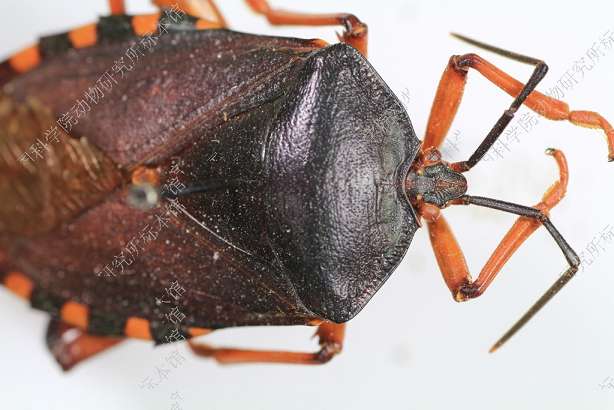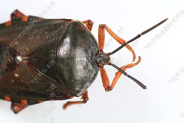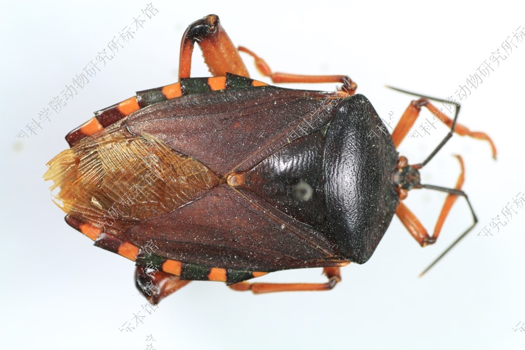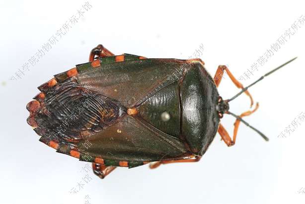 背面紫褐或棕红色,亦有染杂绿色或甚至全绿色的,一般半鞘翅较淡,带红的成分亦较浓;触角黑褐色,基部和第4节端部棕赭色。小盾片端部一律呈较深或淡的棕黄色。侧接缘绿褐或纯绿色,各节基部具淡黄色斑纹,超过全节长度的1/3或1/2。腹面及足全部棕黄或赭黄,仅膝部和爪端黑色。腹部中央具栗色狭直条纹,各节两侧有斜倾栗色细纹两行,位于气门左右侧,有时不甚显著甚至消失。 头面具斜皱纹,两侧叶遇接紧密无小缺口。触角基节超出头端,第3节比第2节短,略长于第4节之半,被有较短密之细毛。前胸面前缘边厚,侧缘斜直。小盾片端部面平或凹度极微。侧接缘阔,表面近乎光滑,仅有少数刻点,后侧角尖形。后腿节端刺指向端方,超过腿节端缘;胫节直。雄虫生殖节后缘从尾面看极为弓弯;雄虫阳基侧突见图。 体长: ♂28-31毫米,♀,29-30毫米。体阔: ♀,15.5-19毫米,♀,16-18毫米。