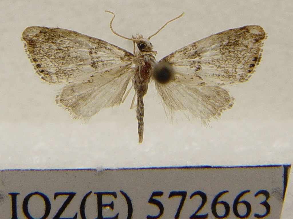 翅展10-12mm。额圆形白色。触角黄色具纤毛;口喙发达;无单眼及毛隆;下唇须伸长,上侧裸露,基节淡黄色,第2节淡黄褐色,第3节黄褐色;下颚须白色、扩展。胸部、领片及翅基片白色略带黄色,腹部白色。前翅底色白色,基域淡黄色盖有暗褐色鳞片,内横线弯曲、暗褐色,外横线波状、黑色,顶部黄色有黑边,亚端域有3个黑点,缘毛黑色。后翅白色杂有黑色鳞片,缘毛白色。雄性外生殖器:爪形突向端部渐细;颚形突戟形;背兜三角形;抱器瓣狭长,抱器背基突长尖,抱器端伸长顶端膨大,刷状;阳端基环狭长板状,附枝狭长硬骨化;阳茎长筒形、弯曲,内有3个棘形角状器。雌性外生殖器:肛乳突三角形,多毛;前表皮突硬骨质化并且末端扩展;交配囊孔为一宽漏斗形;囊导管末端硬骨质化并有许多细刺,近基部膜质;交配囊有1圆形囊片。