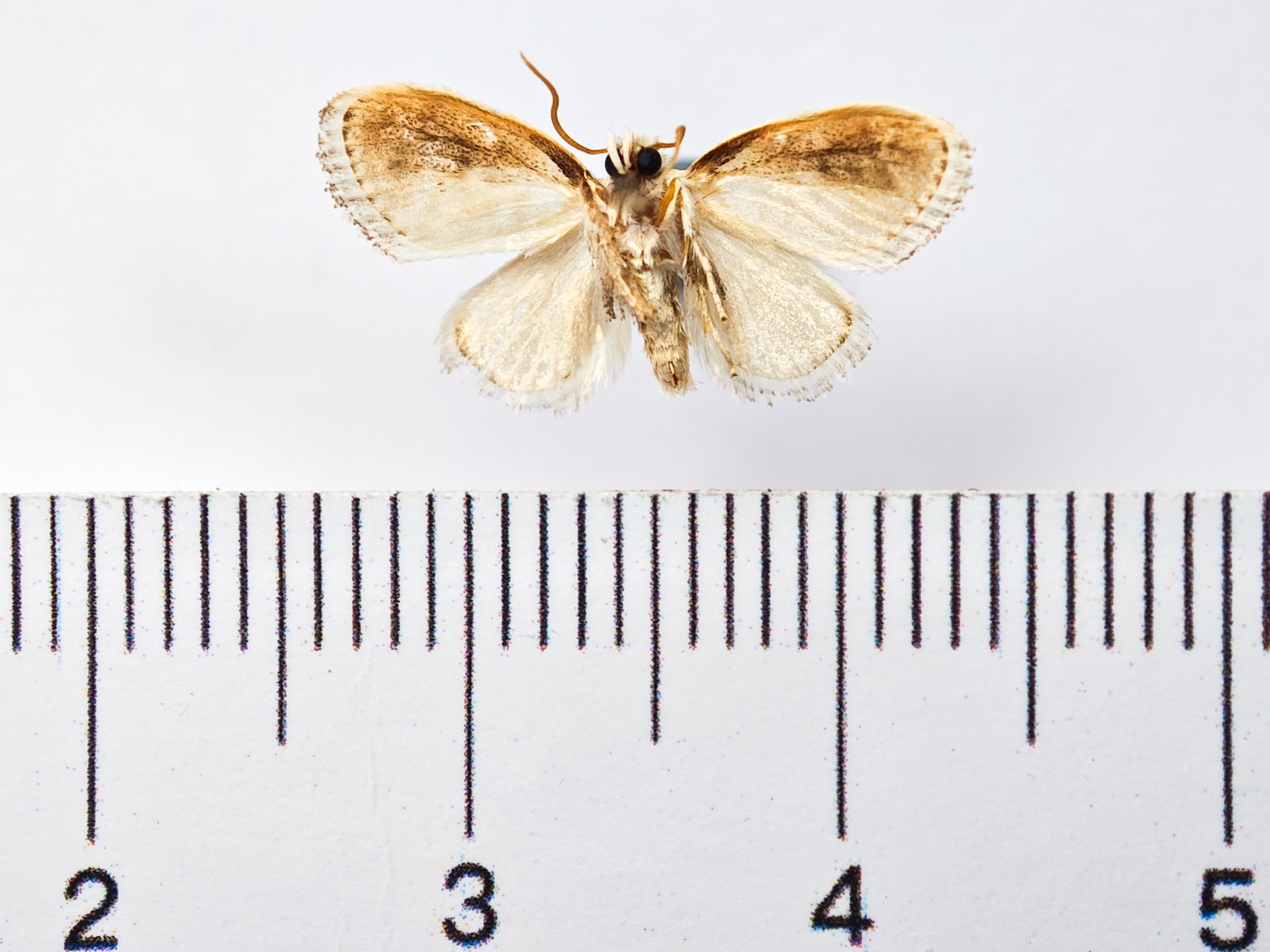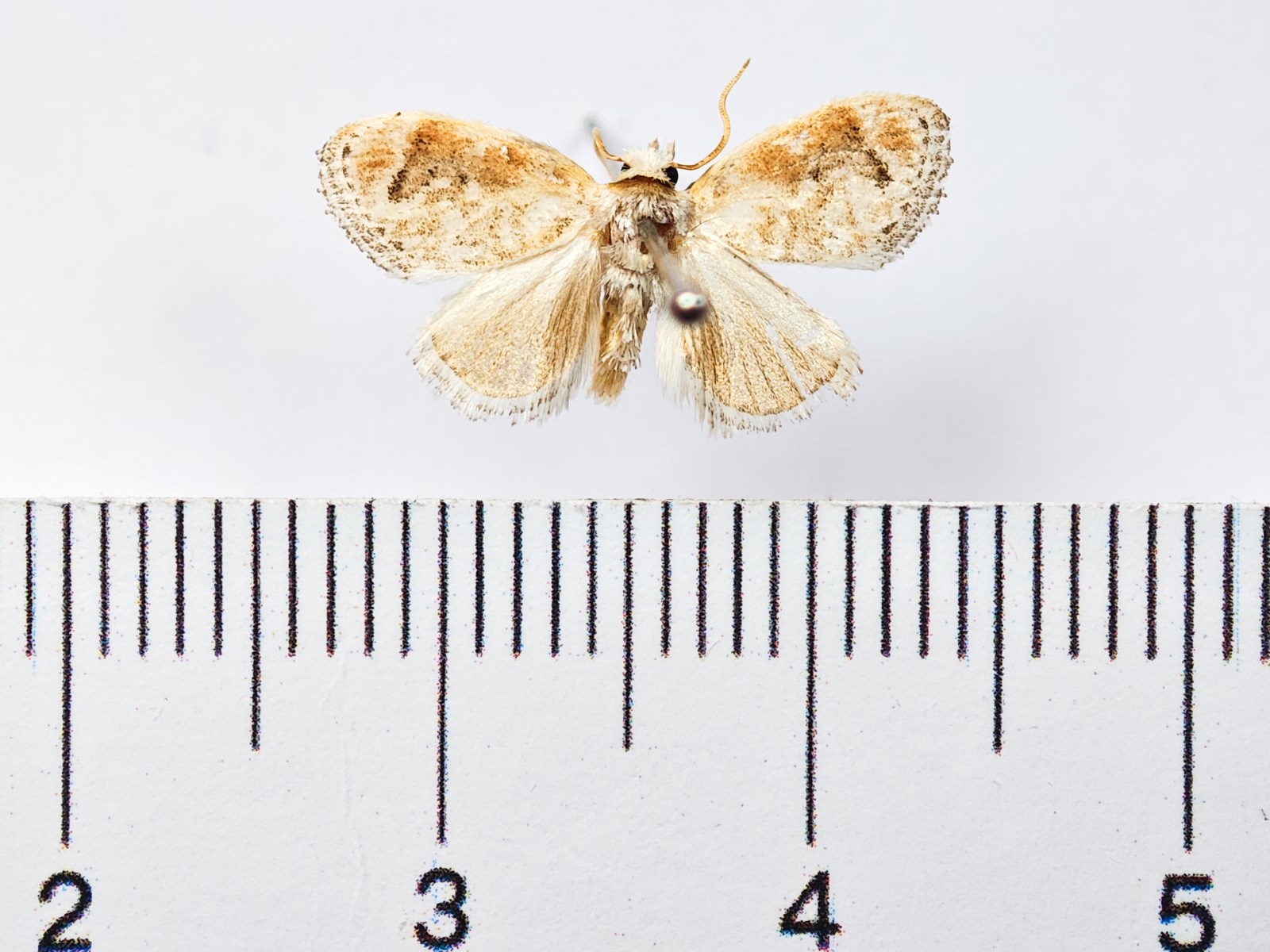 描述翅展16-21mm。全体灰白色,胸腹背面掺有灰黄褐色。前翅赭黄白色,有几块模糊的灰茧褐色斑,似由三条不清晰白色模线分隔而成;亚基线难见,内线在中央呈角形外曲;外线呈不规则弯曲,其中在M2脉呈乳头状外突较可见,此段内侧衬有1条波状黑纹,从前缘下方斜向外伸至M2脉外方,是中室外较大的灰黄褐斑的边缀;横脉纹为一黑点;端线由1列脉间小黑点组成,但Cu1脉以后消失,脉间末端和基部缘毛褐灰色。后翅灰黄色。