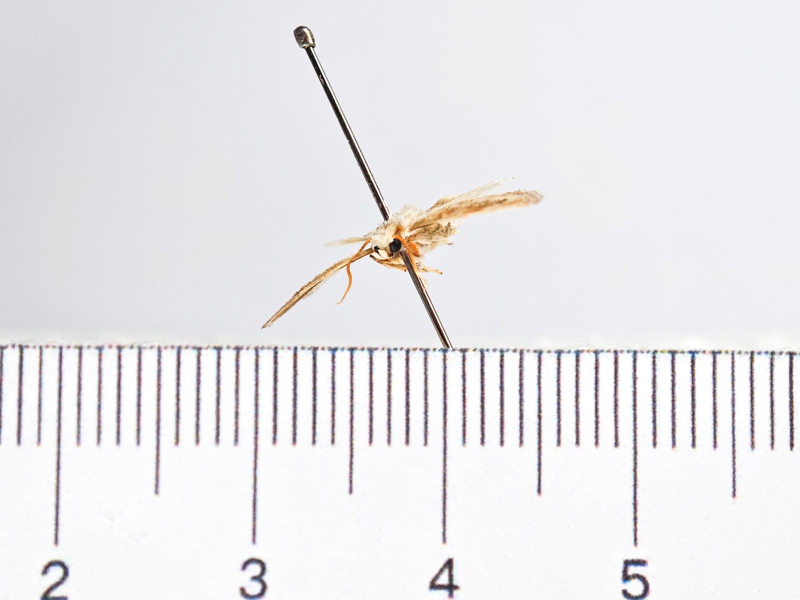 雄性外生殖器:背兜狭长,侧缘密布长毛;爪形突末端中部有1枚小齿突;颚形突大钩状,末端尖;抱器瓣狭长,末端宽圆;阳茎端基环中等骨化,末端无突起。阳茎细,比抱器瓣长,端部有1列钉状突。无明显的囊形突。
