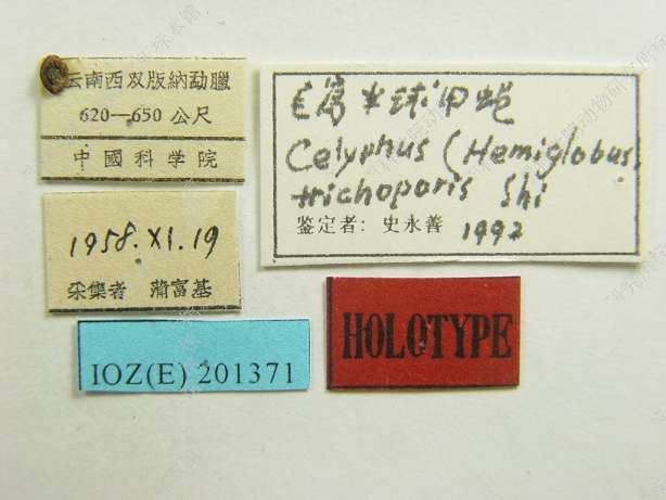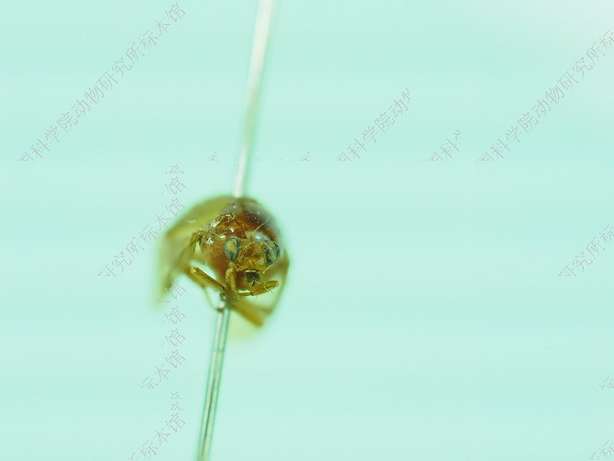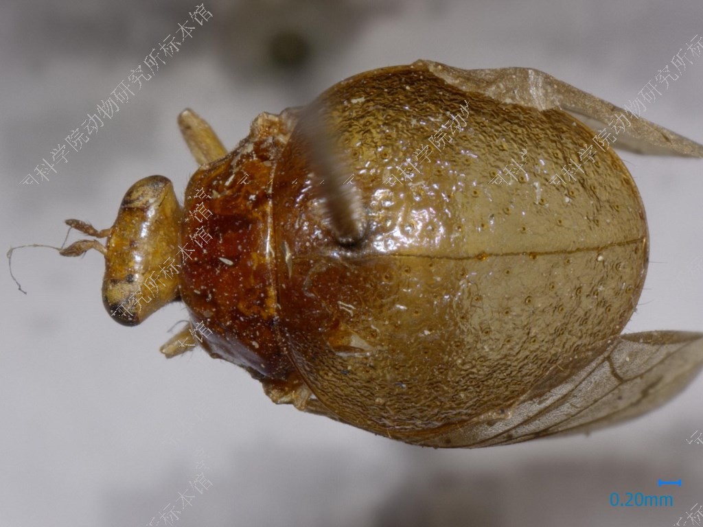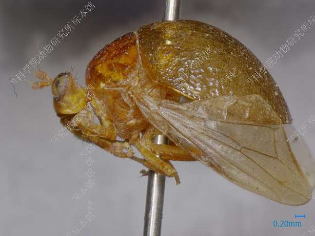 体长5mm,体宽3mm。体黄褐色,头部内、外顶鬃发达,额部在触角节后方和眼眶具明显的暗色毛窝,每一毛窝内着生1根微毛,颊也具大量毛窝,中胸背面基部外侧和肩胛具暗色毛窝;触角黄色,触角第一节略长于触角第二节,触角第二节端部周围被鬃毛状黑毛,第三节宽阔,端部圆,长度约为基部两节的总长;触角忙黑色,基部加粗,大部分细长刚毛状,被纤毛;单眼区黑色,单眼鬃缺如;翅上鬃2根。喙黄褐色。小盾片黄褐色,背面粗糙具皱纹,具排列整齐稀疏的黑色毛窝,每一毛窝内着生1根微毛。足黄褐色,前足腿节西方具1行长鬃。腹部黑色,第二背板两侧各具1黄斑。