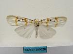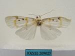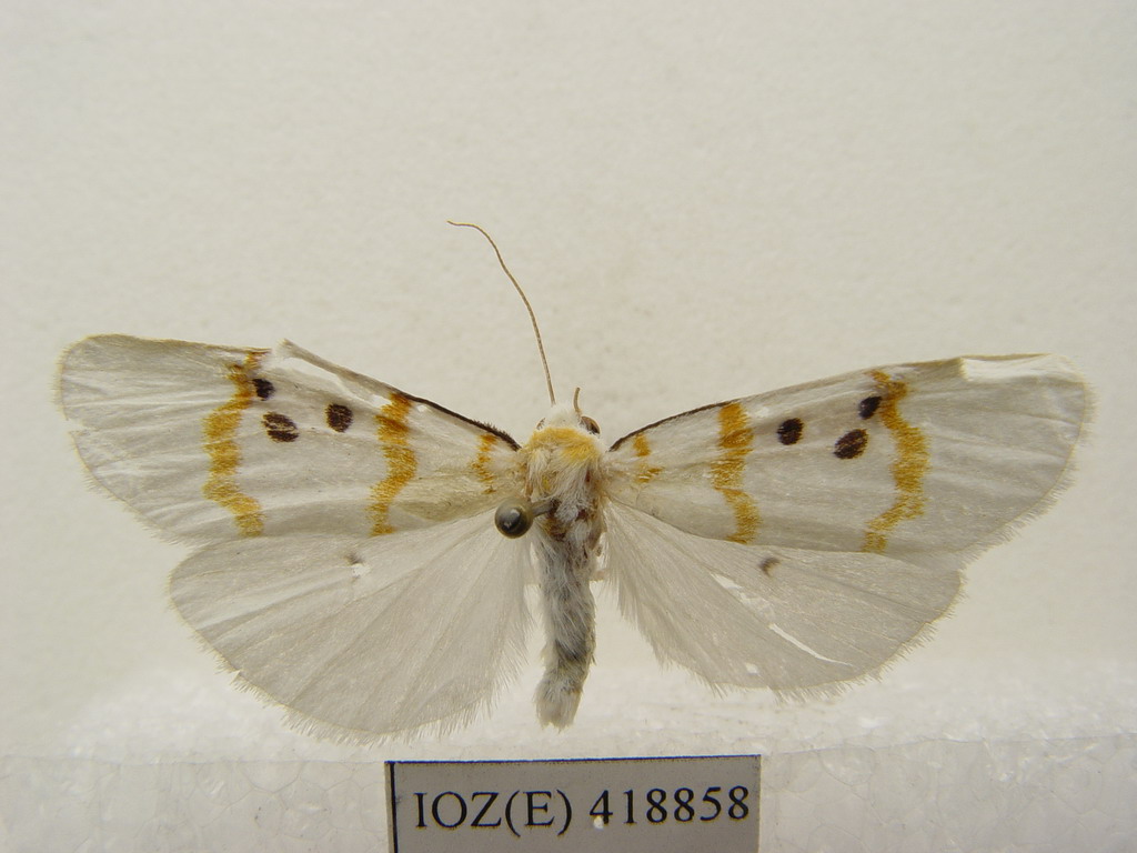 描述翅展40~46mm。白色, 下唇须上方黑色, 下方白色, 颈板具黄边, 翅基片及胸部具黄纹, 前足与中足腿节及胫节白色有黑纹, 跗节黑色, 后足白色、仅跗节有黑斑;前翅横线较细纹雪苔蛾粗, 黄色, 前缘基部至内线有黑边, 亚基线从前缘斜至中室下方、再向外折至亚中褶, 内线微波状在亚中褶处向内折角, 中室近中部1个黑点靠近内线, 中室上、下角各有1个黑点, 外线微波状, 雄蛾反面叶突极微小, 前缘基部黑边明显, 亚基点及中室3个黑点均可见, 中室外半黑色;后翅反面横脉纹黑色。雌前翅外线在中室外向内折角明显。