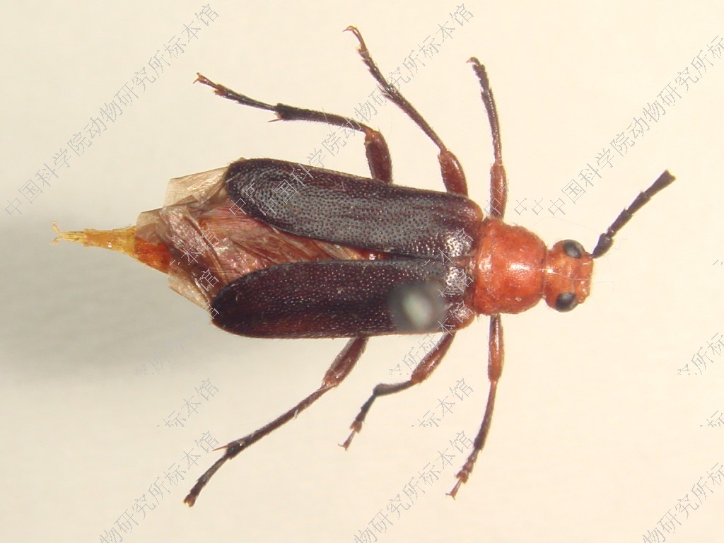 雄:体长10.5-11.5 mm,体宽3 mm。 体较狭小,触角较长,稍超过腹端。雌:体长13-15 mm,体宽,3.5-4 mm。 体宽短扁平,橙黄色,下颚须、复眼、触角、足黑色,有些个体鞘翅背面、后胸暗褐色。头短;额稍隆凸,宽胜于高,高与唇基至上唇端略等,具细刻点,中沟深至头顶后端;触角基瘤隆起,平宽;头顶密布粗密刻点;复眼内缘上半部凹陷,下叶长与其下颊长比为2.5:1;触角着生在复眼内侧中部,长达鞘翅中部,柄节粗短柱形;头在复眼后收狭。前胸背板前端无领片和前横沟,后横沟紧接后缘,很细狭,前胸中部宽胜于长,较头部稍宽,侧缘中部稍前方有1小钝瘤突,其后几直向后缘,后侧角圆钝,背中区隆凸,无中纵沟,表面光滑,散布细微浅刻点,每点着生1根细微黄毛,中央后方近后缘前方有1个小圆形凹陷,其两侧形成一对横椭圆形低隆突。小盾片狭小三角形。鞘翅宽短,肩宽与翅长之比为4:7,翅面刻点细密均匀,但不成行,每点着生细黄毛1支,翅面不平,肩角内侧纵凹陷,中缝两侧隆起,其外侧中部纵凹陷,翅端部1/3中缝向外斜,翅端左右叉开,缝角宽圆,缘角不突出。中胸腹板凸片呈钝三角形,刻点粗密,后端细狭;腹部背面扁平,腹面宽隆,产卵器常伸出、尖狭,末2节露出鞘翅外。足短,后足腿节伸达腹部第三节中部,第一跗节长等于以下各节之和。