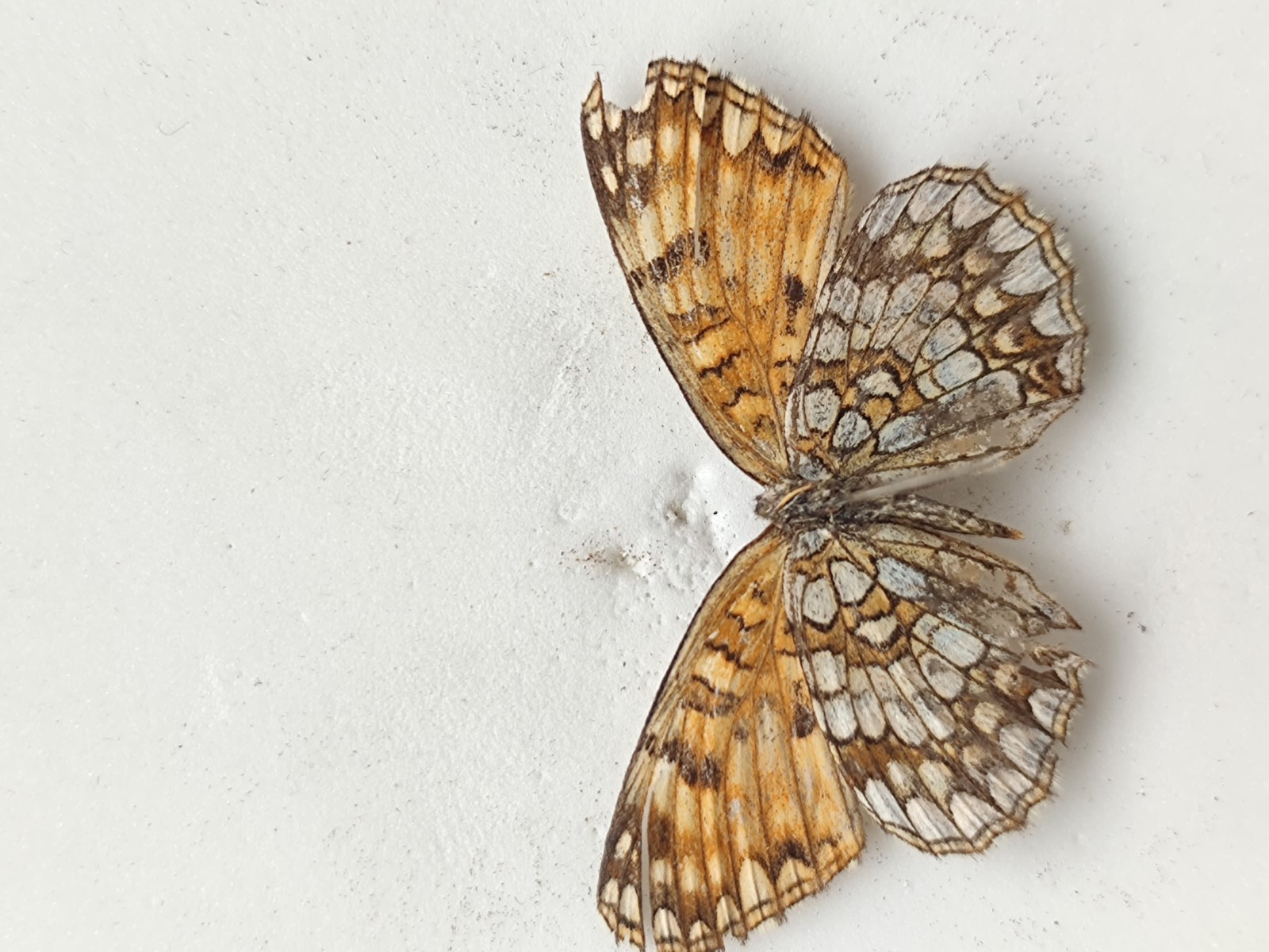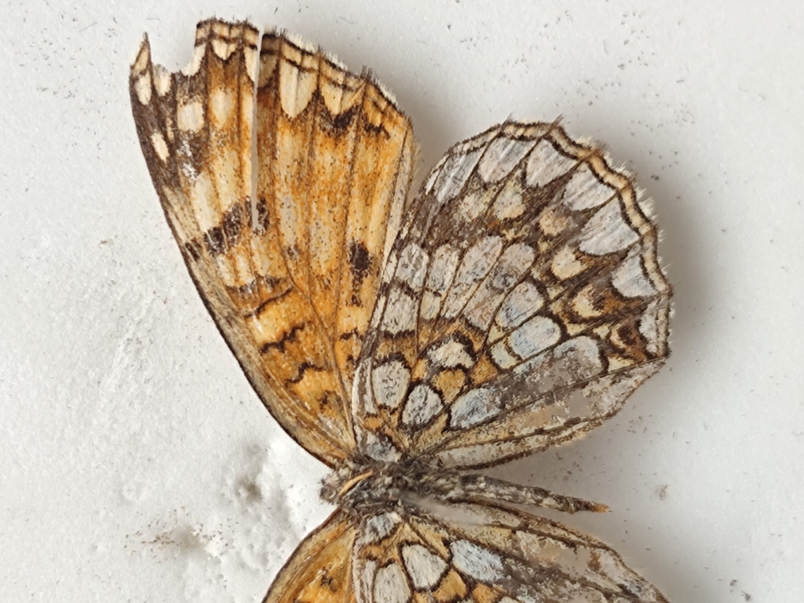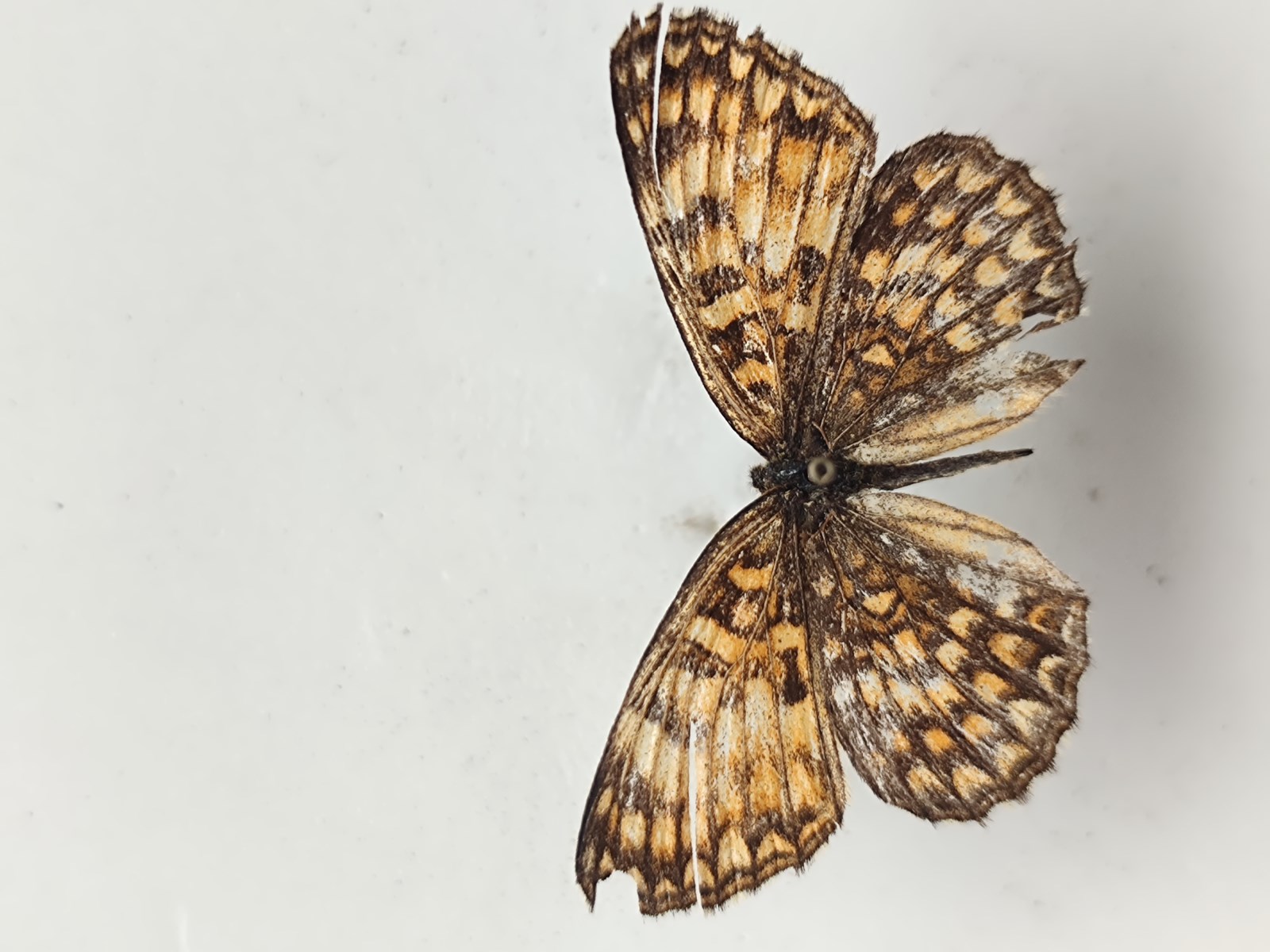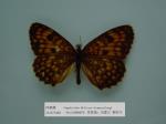 翅黄褐色。外缘有黑色宽带,亚缘带、中外带与中带均略平行,波状曲折,与黑色脉把翅面分割成排列整齐的小方块,前翅中室下域的稍长;中室3个黑斑与其下方2个黑斑相连。后翅近基部有长短不等的3条黑带。反面前翅色淡,后翅青白色,有2条不规则褐色横带。前后翅外缘有2条等距的褐色细线。