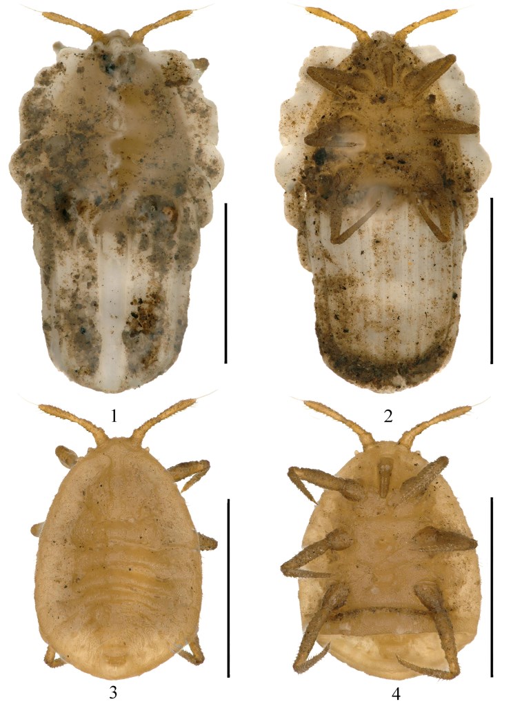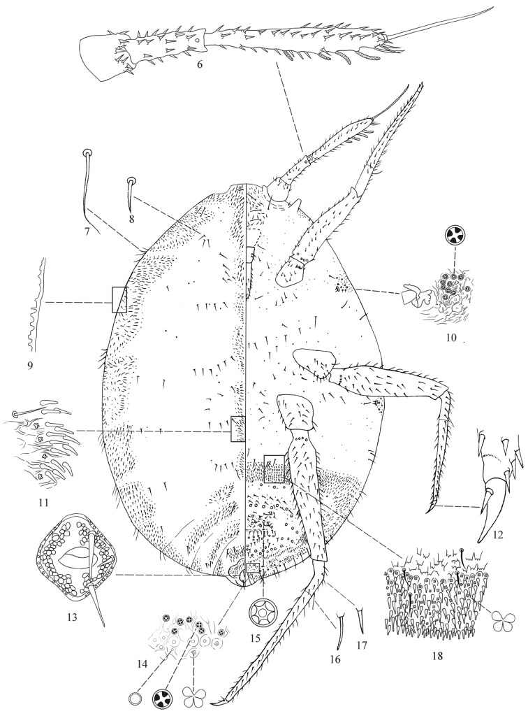 Body oval, brown or yellow. Wax protrusions short, located at the edges of the body and on the dorsal midline. Ovisac as long as body.Slide-mounted female(n=5). Body 1.13–1.37 mm long, 0.91–1.01 mm wide. Antennal segment lengths: 1st 70–109 μm, 2nd 98–146 μm, apical segment 241–335 μm, nearly parallel sided; spine-like setae on antenna each about 17μm long, apical seta 146–153 μm long, subapical seta absent; with 4 flagellate sensory setae, each 19–42 μm long, and 3 hair-like setae; occasionally blunted setae present. Eyes elongate, prominent, each 24–38 μm long. Body cuticle wrinkled, with surface sclerotized. Body margin with seta-like structures.Venter. Labium about 170–183 μm long; stylet loop as long as labium. Leg measurements: coxa: front 97–136 μm, middle 101–130 μm, hind 134–159 μm long; trochanter-femur: front 319–336 μm, middle 322–344 μm, hind 388–393 μm long; tibia-tarsus: front 338–391 μm, middle 372–395 μm, hind 428–460 μm long; claw: front 46 μm, middle 50 μm, hind 60 μm long; claw digitules: front about 9 μm, middle about 15 μm, hind about 15 μm long; legs with rows of robust setae, each seta about 19 μm long, tibia with 1 flagellate sensory seta, about 28 μm long; trochanter with 4 campaniform sensilla on each surface. Some individuals with tibio-tarsal joint faintly detectable, others without a tibio-tarsal separation. Thorax without wax plates. Ovisac band not enclosing rows of spines. Thoracic spiracles each with a cluster of quadrilocular pores laterad of spiracular opening, each group containing about 8-10 pores, each pore 4 μm in diameter; pore group surrounded by some thumb-like simple pores. Diameter of each anterior thoracic spiracle about 18 μm. Hair-like setae few, scattered in medial areas of thorax, with several setae near anterior edge of ovisac band, several associated with anterior and posterior multilocular pore rows. Multilocular pores, each 6 μm in diameter, with 6 loculi around perimeter and 1 loculus in central hub , present in weakly developed rows anterior to, and scattered around, vulva. Abdominal spiracles not seen.