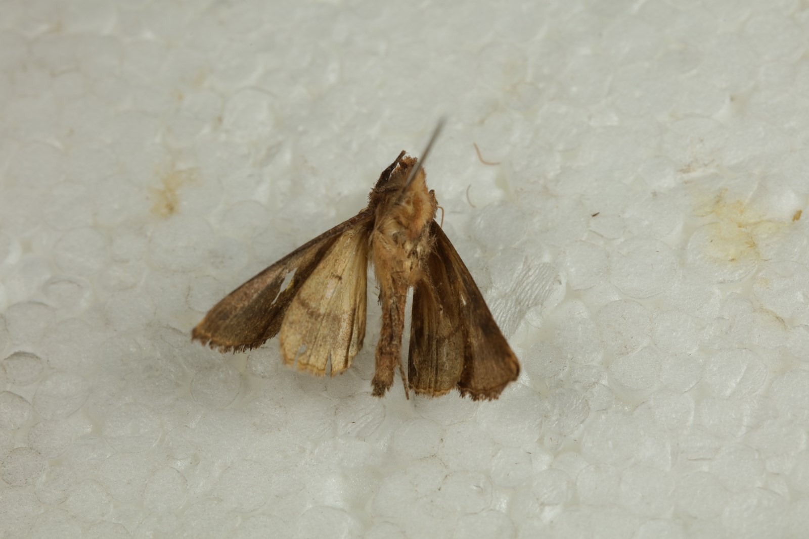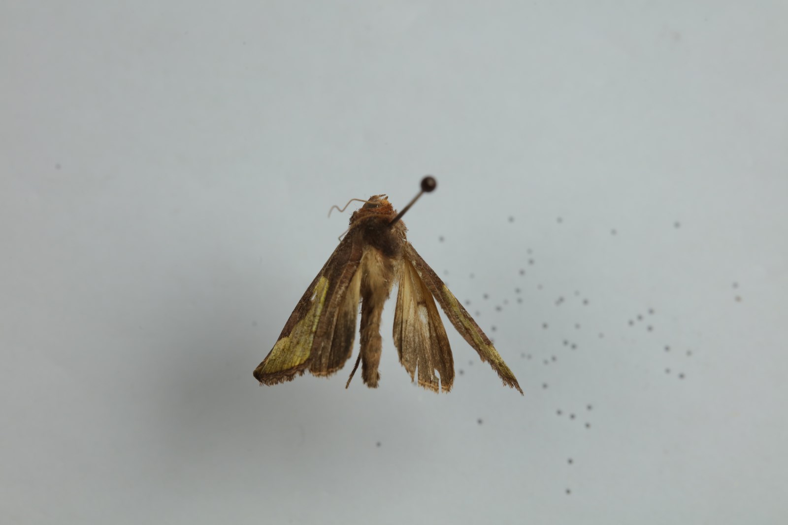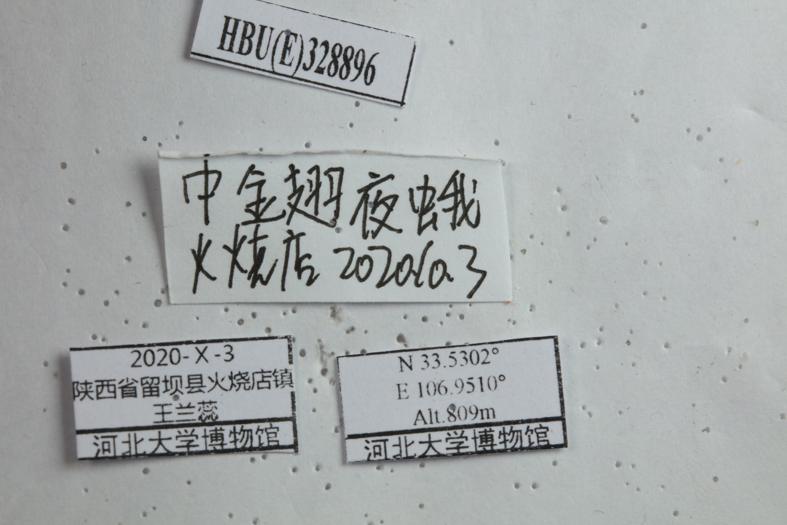 前翅长18 mm。头部与胸部为红褐色,触角背面有白褐相间的鳞片;翅基片及胸部后部褐色;足褐色;腹面黄白色,基节毛簇褐色,腹部侧面及末端带红褐色。前翅深褐色;亚基线和内线灰色,细;环纹和肾纹为灰色细纹,均不明显;翅端半部由前缘外1/4处起至M1后向内伸,最后沿Cu2扩展至中室后缘的部分为大片金黄色;外线前半段褐色,明显,后半段不清晰;亚缘线、缘线和缘毛褐色。后翅黄白色,端半部浅褐色;中室端有褐色纹;缘毛黄褐色。前翅反面黄褐色,前缘部分带红褐色,R脉后和亚缘线内侧暗褐色。