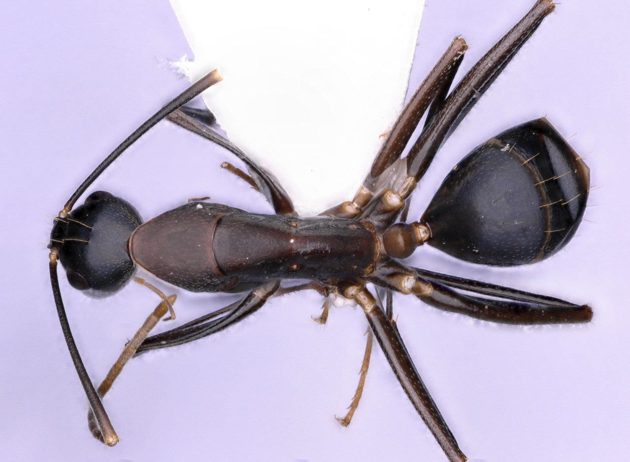 大型工蚁: 正面观头部长宽相等,近梯形,向前变窄,后缘深凹,后角窄圆,侧缘轻度隆起。上颚三角形,咀嚼缘具5齿。唇基近梯形,向前变宽,具钝的中央纵脊,中叶明显前伸,前缘近平直。缺额叶,触角窝外露;额脊较长,到达复眼中央水平。触角12节,柄节约1/6超过头后角,鞭节各节丝状。复眼较小,位于头中线稍后处,远离头侧缘。缺单眼。侧面观胸部背面弓形较完整,被平直的并胸腹节斜面稍打断。前胸背面轻度隆起,前中胸背板缝明显但不凹入;中胸背板轻度隆起,向后缓坡形降低;后胸沟细弱,不凹入。并胸腹节背面轻微隆起,坡形,后上角宽圆形;斜面近平直,陡坡形,约与背面等长;气门椭圆形,位于侧面后下角。腹柄结较薄,轻度前倾,鳞片状,前面轻度隆起,后面近平直,顶端锐角状。后腹部长卵形,5节,前部最宽,向后变狭,端节小,末端开口近圆形。背面观前胸最宽,前缘窄圆,侧缘中度隆起。前中胸背板缝明显,向前弓形弯曲。中胸窄于前胸,近梯形,向后变窄,侧缘轻度隆起。后胸沟细弱,近横形。并胸腹节长宽近相等,近方形,侧缘中度隆起,后侧角近直角形。腹柄结横形,宽大于长,前面中度隆起,后面轻度凹入,两侧锐角状。后腹部长卵形,前中部最宽,向前向后均变狭,第一节前缘强烈隆起。上颚较光滑,具稀疏具毛微刻点。头部较光滑,具稀疏具毛微刻点。胸部、腹柄和后腹部光滑发亮。身体背面具丰富亚直立至亚倾斜毛和丰富平伏短绒毛被,前胸背板立毛较密集,并胸腹节背面前部缺立毛;柄节背面具密集平伏短绒毛被,顶端具少数立毛;胫节背面具密集平伏绒毛被,缺立毛。身体棕黄色,复眼浅黑色,上颚和后腹部暗棕红色,后腹部各节后缘灰白色。小型工蚁:与大型工蚁相似,但身体较小。头较小,长显著大于宽,近长方形,后缘宽圆,后角宽圆,侧缘轻度隆起。唇基前缘轻度隆起。触角较长,柄节约5/9超出头后角。复眼较大,刚到达头侧缘。侧面观并胸腹节背面很长,近平直,后上角宽圆;斜面很短,约为背面长的1/4。腹柄结厚,三角形,前面坡形近平直,后面陡坡形近平直,顶端尖锐。身体背面立毛稀疏。头部和后腹部黑色,胸部和腹柄棕黄色,触角柄节和足暗棕黄色,复眼灰色。