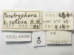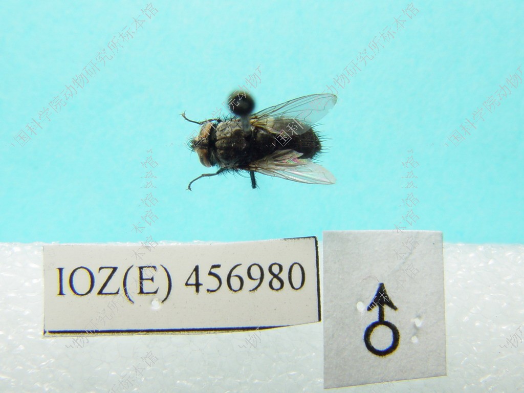♂ 体小形,黑色,具光泽,复眼被毛,额宽为复眼宽的2/3,间额棕黑色,与侧额大致等宽,侧额及侧颜覆黄灰色粉被,颜、颊及后头覆灰色粉被,侧颜裸、上宽下窄,最窄处为触角第3节宽的1/3,额鬃5-7根,其中2根下降至侧颜,前面1根达触角第2节末端水平,内侧额鬃每侧1根、粗大,单眼鬃发达,大小与内侧额鬃相仿,后头平,上半部在眼后鬃后方有1行黑毛,其余部分被灰白色毛;触角黑色,第3节基缘棕红色,其长度约为第2节的3倍,触角芒基部1/2加粗,下颚须基部黑或棕黑色,端部黄或棕黄色。胸部黑色,覆稀薄的灰褐色粉被,背面具4个黑纵条;中鬃3+3,背中鬃3+4,翅内鬃1+3,翅前鬃大小与第1根沟后翅内鬃相似,腹侧片鬃1+1,如为2+1则其中下面1根细小呈毛状,与其余2根排列于一直线;小盾片全黑色,覆稀薄的灰褐色粉被,小盾侧鬃缺如,小盾心鬃或有或无;翅狭长,前缘脉第3段为第2段长的2.5倍,r4+5基部具2-3根小鬃,下腋瓣黄白色。腹部全黑色,有光泽,覆灰白色粉被,粉被在第3、4背板1/2或2/3较浓厚,腹背中央具1黑色纵条,在第2和第5背板粉被极稀薄,腹部毛较短,倒伏状排列,第2、3背板各具1对中缘鬃,第4、5背板各具1行缘鬃。足棕黑色、前足爪长、胫节具1根后鬃,中胫具1根背背鬃,后胫具整齐的疏状前背鬃。 ♀ 额宽为复眼宽的4/5,每侧各具2根内侧额鬃和2根外侧额鬃,下颚须金黄色,端部显著加粗,前足爪短。 体长 4.5-6.5 mm。