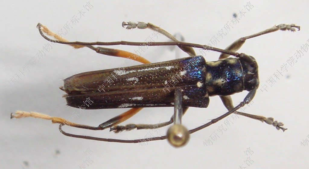 描述一般雌虫休较大,雄虫体较小,体长形,基底蓝绿至深蓝色,覆盖有黑褐至黑色绒毛,具有淡黄色或白色毛斑;鞘翅肩呈蓝绿色光泽,鞘翅侧缘及后半部略显紫铜色光泽;触角黑色,被有棕褐色绒毛;足棕红色,前、中足大部分及后足胫节部分黑色。额两侧至头顶两侧及颊被覆浓密淡黄色或白色绒毛,有时整个额部均被稀疏绒毛。前胸背板有9 个大小不等的淡黄色毛斑,前缘4 个,后缘4 个及中后端一个,一般中央的一个较大。小盾片末端被淡黄色绒毛。鞘翅一般有5 个白色小斑,靠中缝一列有2 个,位于翅基部四分之一及翅中部;靠肩部一列有3 个,分别位于翅基部三分之一、中部及中部之后;有时基缘中央有一个白色小毛斑。体腹面除腹部末节外,大多数两侧具白色毛斑。头部上唇两侧各有一条斜横凹,其上着生绒毛;额长略胜于宽,中央有一条细沟,头顶浅凹;雄虫复眼下叶三倍于颊,雌虫复眼下叶二倍于颊,头密布刻点。雄虫触角超过体长的四分之一,雌虫触角与虫体等长,基部5节下面有稀少缨毛,柄节略膨大,第三节长于第四节。前胸背板长宽近于相等,或宽略胜于长,胸面密布较粗的刻点。小盾片三角形,端角圆形。鞘翅较长,末端稍窄,端缘平切,缘角较尖;每翅肩下有两条纵隆脊,靠外缘有两列规则刻点,其余翅面刻点较粗,不规则;翅端刻点较细。足较细,后足第一跗节长于其余跗节之和,前、中足跗节爪呈附齿式,后足跗节爪呈单齿式。雄虫腹部末节后缘中央微凹,并着生有长毛,雌虫腹部末节中央有一条细纵沟,伸至中部。