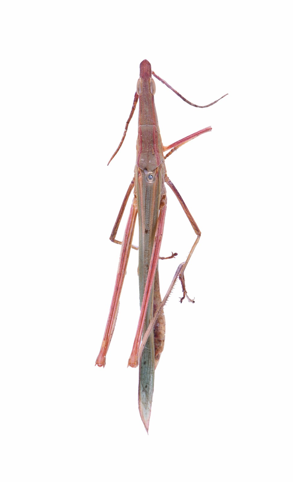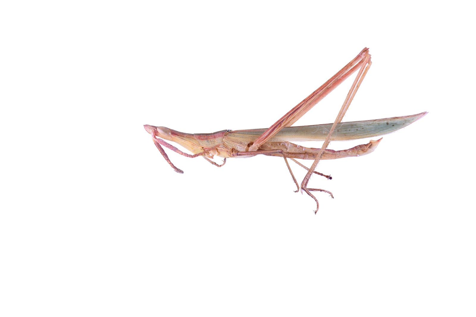 雌雄异型,雄性30.0-47.0mm,雌性58.0-81.0mm。体大型,禾叶状的蝗虫。头圆锥形,颜面极倾斜,头顶突出,顶圆。触角剑状,中部扁宽。复眼长卵型。前胸背板宽平,后缘尖锐。各足同体色,后足十分修长。前翅狭长,翅端尖锐,后翅宽阔,米黄色。腹部狭长,背面紫褐色。体色多样,纯绿色,或绿色带褐色杂斑,或褐色具深褐色斑点。