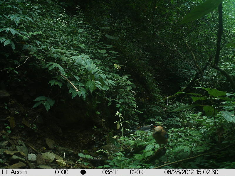 大型鸦类,体长54~65cm。嘴、脚红色,头、颈、喉和胸黑色,头顶至后颈有一块白色至淡蓝白色或紫灰色块斑,其余上体紫蓝灰色或淡蓝灰褐色。尾长呈凸状具黑色亚端斑和白色端斑。下体白色。 雌雄羽色相似。前额、头顶至后颈、头侧、颈侧、颏、喉和上胸全为黑色,头顶至后颈各羽具白色、蓝白色或紫灰色羽端,且从头顶往后此端斑越来越扩大,形成一个从头顶至后颈,有时甚至到上背中央的大型块斑。背、肩、腰紫蓝灰色或灰蓝沾褐,尾上覆羽淡紫蓝色或淡蓝灰色、具黑色端斑和白色次端斑。尾长、呈凸状。中央尾羽蓝灰色具白色端斑,其余尾羽紫蓝色或蓝灰色、具白色端斑和黑色次端斑。两翅黑褐色,初级飞羽外翈基部紫蓝色,末端白色,次级飞羽内外翈均具白色端斑,外翈羽缘紫蓝色。 下体喉、胸黑色,其余下体白色、有时沾蓝或沾黄色。 虹膜橘红色。嘴和脚红色。