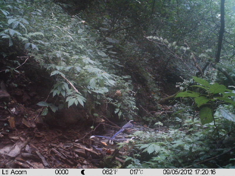 大型鸦类,体长54~65cm。嘴、脚红色,头、颈、喉和胸黑色,头顶至后颈有一块白色至淡蓝白色或紫灰色块斑,其余上体紫蓝灰色或淡蓝灰褐色。尾长呈凸状具黑色亚端斑和白色端斑。下体白色。 雌雄羽色相似。前额、头顶至后颈、头侧、颈侧、颏、喉和上胸全为黑色,头顶至后颈各羽具白色、蓝白色或紫灰色羽端,且从头顶往后此端斑越来越扩大,形成一个从头顶至后颈,有时甚至到上背中央的大型块斑。背、肩、腰紫蓝灰色或灰蓝沾褐,尾上覆羽淡紫蓝色或淡蓝灰色、具黑色端斑和白色次端斑。尾长、呈凸状。中央尾羽蓝灰色具白色端斑,其余尾羽紫蓝色或蓝灰色、具白色端斑和黑色次端斑。两翅黑褐色,初级飞羽外翈基部紫蓝色,末端白色,次级飞羽内外翈均具白色端斑,外翈羽缘紫蓝色。 下体喉、胸黑色,其余下体白色、有时沾蓝或沾黄色。 虹膜橘红色。嘴和脚红色。