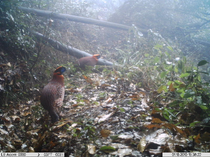 描述:体大(68厘米)而尾短。雄鸟绯红,上体多有带黑色外缘的白色小圆点,下体带灰白色椭圆形点斑。头黑,眼后有金色条纹,脸部裸皮蓝色,具可膨胀的喉垂及肉质角。与红胸角雉区别在于下体灰白色点斑较大且不带黑色外缘。雌鸟较小,具棕色杂斑,下体有大块白色点斑。 虹膜-褐色;嘴-黑,嘴尖粉红;脚-粉色至红色。 声音:雄鸟发出似婴儿啼哭的wu, wa…, ga, ga或nyear-ni声来维护巢域。雌鸟繁殖季节发出wa, wa 叫声,告警时叫声似鸭叫的quack-quack-quack。 分布范围:喜马拉雅山脉东部,缅甸北部和(越南的)东京西北,至中国中部。 分布状况:广泛分布的地方性常见鸟,见于西藏东南部、云南西部及北部、四川、甘肃南部、陕西南部、贵州、湖北、湖南及广西北部海拔 2000~3900米(冬季下至1000米)。 习性:单个或家族栖于亚高山林的林下。不惧生。夜栖枝头。雄鸟炫耀时膨胀喉垂并竖起蓝色肉质角,喉垂完全膨起时有蓝红色图案。