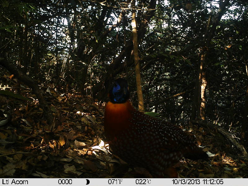 习性:单个或家族栖于亚高山林的林下。不惧生。夜栖枝头。雄鸟炫耀时膨胀喉垂并竖起蓝色肉质角,喉垂完全膨起时有蓝红色图案。