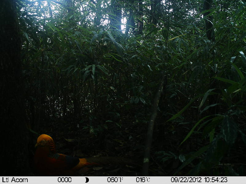 描述:雄鸟:体型显小但修长(98厘米),头顶及背有耀眼的金色丝状羽;枕部披风为金色并具黑色条纹;上背金属绿色,下体绯红。翼为金属蓝色,尾长而弯曲,中央尾羽近黑而具皮黄色点斑,其余部位黄褐色。雌鸟体型较小,为黄褐色,上体密布黑色带斑,下体淡皮黄色。 虹膜-黄色;嘴-绿黄;脚-角质黄色。 声音:雌鸟春季发出cha-cha的叫声。其他雌鸟应叫。雄鸟回以gui-gui, gui或 gui-gu, gu, gu或悦耳的短促gu gu gu…声。飞行时,雄鸟发出快速的zi zi zi…叫声。 分布范围:中国中部特有种。 分布状况:全球性近危(Collar et al., 1994)。常见于海拔800~1600 米,偶上至2800 米。留鸟,分布在青海东南部、甘肃南部、四川、陕西南部、湖北西部、贵州、广西北部及湖南西部。 习性:单独或成小群活动,喜有矮树的山坡及次生的亚热带阔叶林及落叶阔叶林。常被驯养。