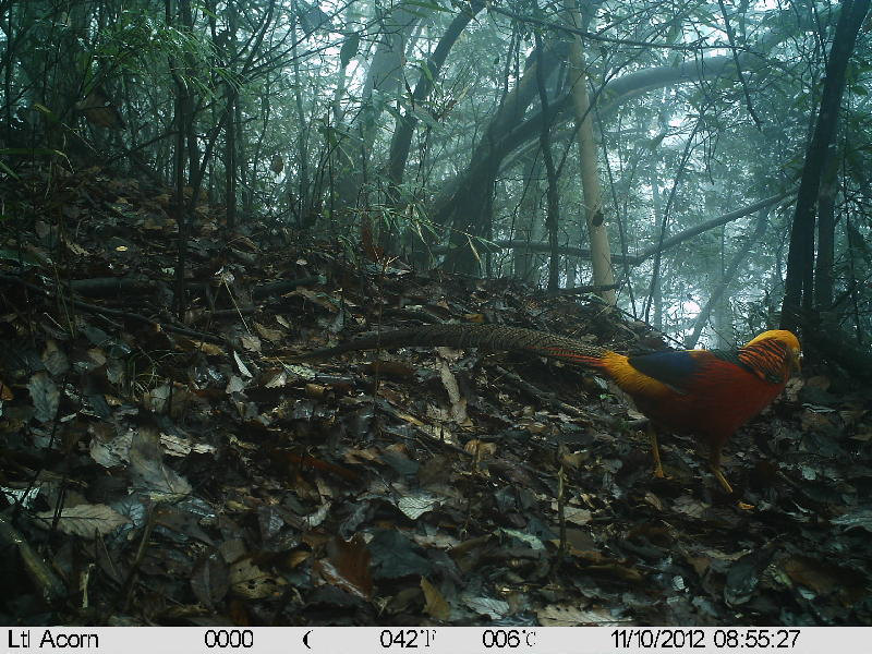 描述:雄鸟:体型显小但修长(98厘米),头顶及背有耀眼的金色丝状羽;枕部披风为金色并具黑色条纹;上背金属绿色,下体绯红。翼为金属蓝色,尾长而弯曲,中央尾羽近黑而具皮黄色点斑,其余部位黄褐色。雌鸟体型较小,为黄褐色,上体密布黑色带斑,下体淡皮黄色。 虹膜-黄色;嘴-绿黄;脚-角质黄色。 声音:雌鸟春季发出cha-cha的叫声。其他雌鸟应叫。雄鸟回以gui-gui, gui或 gui-gu, gu, gu或悦耳的短促gu gu gu…声。飞行时,雄鸟发出快速的zi zi zi…叫声。 分布范围:中国中部特有种。 分布状况:全球性近危(Collar et al., 1994)。常见于海拔800~1600 米,偶上至2800 米。留鸟,分布在青海东南部、甘肃南部、四川、陕西南部、湖北西部、贵州、广西北部及湖南西部。 习性:单独或成小群活动,喜有矮树的山坡及次生的亚热带阔叶林及落叶阔叶林。常被驯养。