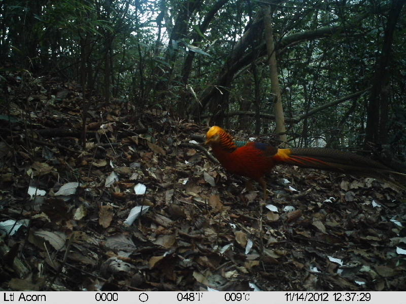 描述:雄鸟:体型显小但修长(98厘米),头顶及背有耀眼的金色丝状羽;枕部披风为金色并具黑色条纹;上背金属绿色,下体绯红。翼为金属蓝色,尾长而弯曲,中央尾羽近黑而具皮黄色点斑,其余部位黄褐色。雌鸟体型较小,为黄褐色,上体密布黑色带斑,下体淡皮黄色。 虹膜-黄色;嘴-绿黄;脚-角质黄色。 声音:雌鸟春季发出cha-cha的叫声。其他雌鸟应叫。雄鸟回以gui-gui, gui或 gui-gu, gu, gu或悦耳的短促gu gu gu…声。飞行时,雄鸟发出快速的zi zi zi…叫声。 分布范围:中国中部特有种。 分布状况:全球性近危(Collar et al., 1994)。常见于海拔800~1600 米,偶上至2800 米。留鸟,分布在青海东南部、甘肃南部、四川、陕西南部、湖北西部、贵州、广西北部及湖南西部。 习性:单独或成小群活动,喜有矮树的山坡及次生的亚热带阔叶林及落叶阔叶林。常被驯养。