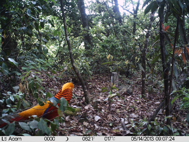 描述:雄鸟:体型显小但修长(98厘米),头顶及背有耀眼的金色丝状羽;枕部披风为金色并具黑色条纹;上背金属绿色,下体绯红。翼为金属蓝色,尾长而弯曲,中央尾羽近黑而具皮黄色点斑,其余部位黄褐色。雌鸟体型较小,为黄褐色,上体密布黑色带斑,下体淡皮黄色。 虹膜-黄色;嘴-绿黄;脚-角质黄色。 声音:雌鸟春季发出cha-cha的叫声。其他雌鸟应叫。雄鸟回以gui-gui, gui或 gui-gu, gu, gu或悦耳的短促gu gu gu…声。飞行时,雄鸟发出快速的zi zi zi…叫声。 分布范围:中国中部特有种。 分布状况:全球性近危(Collar et al., 1994)。常见于海拔800~1600 米,偶上至2800 米。留鸟,分布在青海东南部、甘肃南部、四川、陕西南部、湖北西部、贵州、广西北部及湖南西部。 习性:单独或成小群活动,喜有矮树的山坡及次生的亚热带阔叶林及落叶阔叶林。常被驯养。