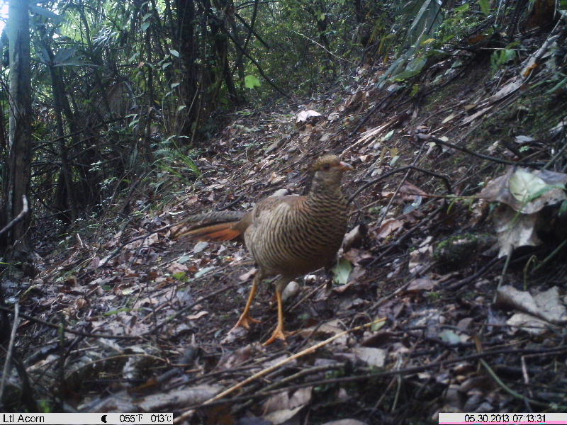 描述:雄鸟:体型显小但修长(98厘米),头顶及背有耀眼的金色丝状羽;枕部披风为金色并具黑色条纹;上背金属绿色,下体绯红。翼为金属蓝色,尾长而弯曲,中央尾羽近黑而具皮黄色点斑,其余部位黄褐色。雌鸟体型较小,为黄褐色,上体密布黑色带斑,下体淡皮黄色。 虹膜-黄色;嘴-绿黄;脚-角质黄色。 声音:雌鸟春季发出cha-cha的叫声。其他雌鸟应叫。雄鸟回以gui-gui, gui或 gui-gu, gu, gu或悦耳的短促gu gu gu…声。飞行时,雄鸟发出快速的zi zi zi…叫声。 分布范围:中国中部特有种。 分布状况:全球性近危(Collar et al., 1994)。常见于海拔800~1600 米,偶上至2800 米。留鸟,分布在青海东南部、甘肃南部、四川、陕西南部、湖北西部、贵州、广西北部及湖南西部。 习性:单独或成小群活动,喜有矮树的山坡及次生的亚热带阔叶林及落叶阔叶林。常被驯养。
