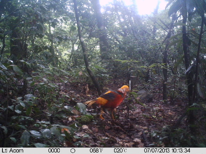 描述:雄鸟:体型显小但修长(98厘米),头顶及背有耀眼的金色丝状羽;枕部披风为金色并具黑色条纹;上背金属绿色,下体绯红。翼为金属蓝色,尾长而弯曲,中央尾羽近黑而具皮黄色点斑,其余部位黄褐色。雌鸟体型较小,为黄褐色,上体密布黑色带斑,下体淡皮黄色。 虹膜-黄色;嘴-绿黄;脚-角质黄色。 声音:雌鸟春季发出cha-cha的叫声。其他雌鸟应叫。雄鸟回以gui-gui, gui或 gui-gu, gu, gu或悦耳的短促gu gu gu…声。飞行时,雄鸟发出快速的zi zi zi…叫声。 分布范围:中国中部特有种。 分布状况:全球性近危(Collar et al., 1994)。常见于海拔800~1600 米,偶上至2800 米。留鸟,分布在青海东南部、甘肃南部、四川、陕西南部、湖北西部、贵州、广西北部及湖南西部。 习性:单独或成小群活动,喜有矮树的山坡及次生的亚热带阔叶林及落叶阔叶林。常被驯养。