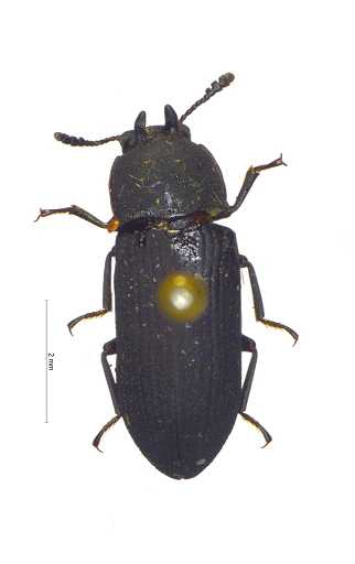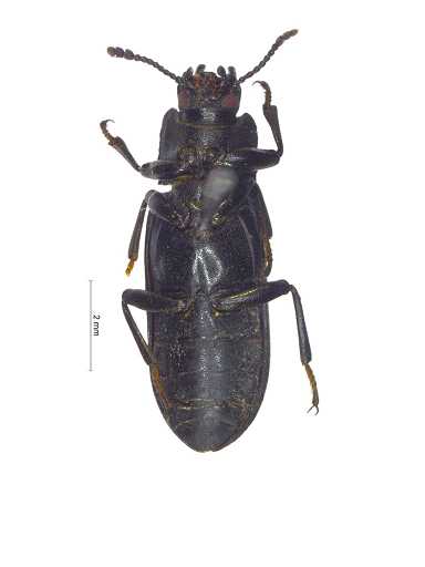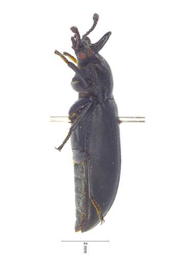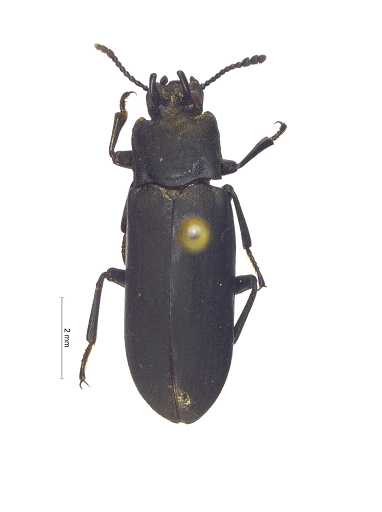 描述:体狭长,平行,黑色,略昏暗;唇基前缘几直,中部略隆,唇基沟明显半圆形,头部具刻点,触角4节棒。前胸背板近方形,横切,中部之前轻微拱形,盘区刻点浓密,刻点间散布小刻点,前缘几直略拱,侧缘几直弱弧形向基部渐缩,饰边完整,基部二曲的,无饰边;前角钝圆略伸出,后角锐近直角。小盾片三角形,具细小刻点。鞘翅微具刻点条的,行上刻点规则均一,行间扁平略隆,具极小刻点。腹面光亮,浓密的适度的细的刻点,雄性头部2个圆锥状的角,无毛,几乎平行,雌性头部眼内仅仅是隆突的。