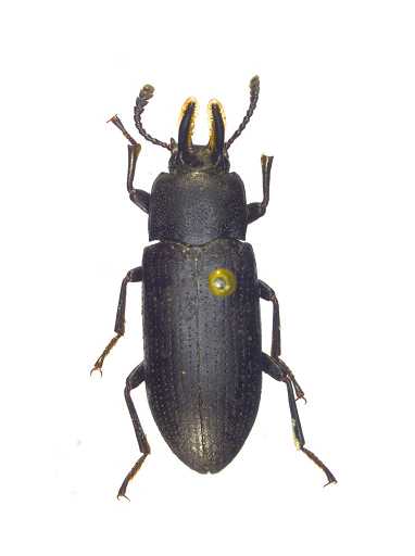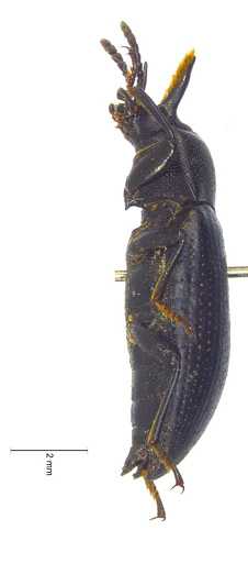 描述:体狭长,污黑色,有光泽。头近于方形,唇基前缘近于直,前角钝,略上翘,中部2枚近于平行的长直角,其端部略弯,有稠密小刻点;眼内角显长,直立和近于平行,其端部外缘被棕色弯毛;额上1纵凹,其底部光滑,侧区有稀疏小刻点;后颊刻点皱纹状。触角第9~10节近于等宽,内侧突出。前胸背板宽是长的1.3倍;前缘浅凹,中部近于直,仅两侧具饰边;侧缘近于平直,饰边窄而完整;基部2湾,无饰边;前角突出,后角亚直角形;盘区明显隆起,刻点深圆和稠密,其间散布小刻点。小盾片有油污和细刻点。鞘翅略宽于前胸背板基部,肩近于直形角,两侧饰边完整;鞘翅微拱,具油污;刻点行深,行间扁平并有粗糙小粒。颏心形;前缘凹,中间隆起,两侧各具1尖齿。前胸侧板中间隆起,具粗糙圆刻点;腹板中部隆起,有皱纹刻点;腹突短,顶圆,有中纵沟和粗糙刻点。中胸腹板中部有1坑,两侧有粗糙刻纹。后胸腹板中部粗糙并有伏毛,两侧光滑。腹部刻点小,具伏毛。阳茎长2.14 mm,基侧突长于基板1.13倍。