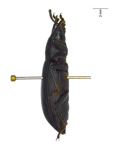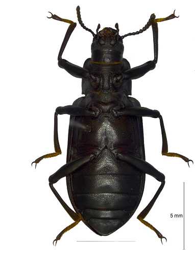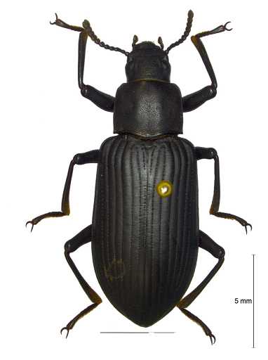 描述:黑色,口须、上唇和触角深棕色,具弱光泽。上唇梯形,中间具横隆,密布小圆刻点;前缘直,被棕毛。唇基前缘近于直,侧角圆;前颊圆形,后颊阶梯状收缩;额区扁平,常具皱纹,眼褶明显,刻点前密后稀。触角长达前胸背板中部,第3节长于4节1.5倍,后者略长于第5节,第6~7节长大于宽,第8节长宽近相等,第9~10节宽大于长,末节粗大,卵形。颏倒梯形,背面前高后低,基部被疏毛,前端圆,两侧斜直。前胸背板近横方形,宽大于长1.25倍;前缘近于直,仅两侧有饰边;侧缘中间最宽,由中部向前斜直地、向后急剧地收缩,基部之前缢缩,饰边完整;基部中间宽圆,两侧斜直,饰边粗;前角钝圆,后角尖突;背面圆拱,基部两侧各有1斜短线,布均匀的疏点。小盾片三角形,有疏点。鞘翅长大于宽3.14倍,前缘弯曲、低凹;最宽处位于翅坡之前,背面观饰边完整;刻点行由内向外变粗,行间隆起,仅内侧3个行间有小刻点。前胸侧板有模糊刻点和皱纹;腹突宽扁,两侧具纵沟,顶圆。中胸腹突颈状部有中脊和横皱纹,后缘两侧突出,前、后侧片布刻点和皱纹。后胸腹板中间光滑并有明显中沟,仅侧缘和侧片有刻点。腹部各节有相同的刻点和皱纹;肛节沿外侧饰边在端部粗。前足腿节棍棒状,下缘直,上缘显隆。中、后足腿节较直;胫节基部2/3直,端部弯曲,其内侧被金色毛。