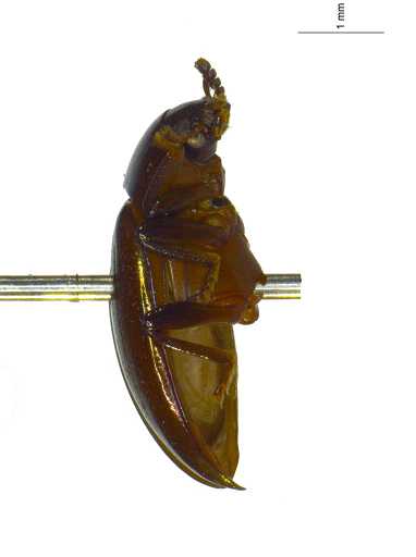 头梯形,隆,宽大于长约 1.29 倍,密布小刻点;唇基前缘几乎直,密布刻点;额隆,向前倾斜,眼间距与眼直径之比约 1.78;额唇基沟浅,清晰;颊宽大于长约 1.5 倍。复眼圆,眼内沟短,深。触角末端 2 节丢失,2~9 节各节相对长宽比约:10.0(7.5):15.0(6.5):11.0(7.0):9.0(7.5):13.0(10.0):12.0(11.5):13.0(14.0):13.5(16.0)。下颚须末节斧状,顶角尖。颏倒梯形,基部前有少许长毛。前胸背板方形,横阔,宽大于长约 1.66 倍;基部 1/3 最宽,侧缘由此向前收缩至端部,基部前不弯曲;侧缘无沟,饰边较前缘细。前缘凹,中间直,饰边中间 1/5 间断;后缘中间浅凹;前角近直角形,钝;后角直角形,尖;盘区弱隆,布稀疏刻点;基部 1 对纵的窝,浅。小盾片长大于宽,光滑。